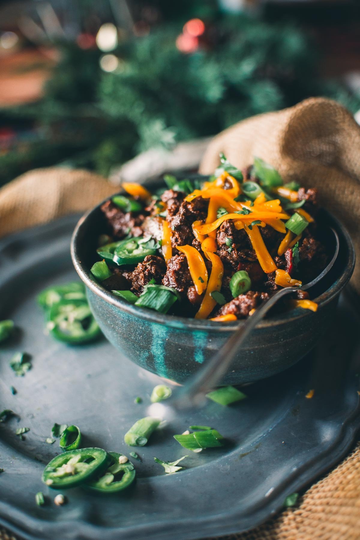 Serve hot in bowls, topped with shredded cheddar cheese, onions, green onions, sour cream, and jalapeños or any of your favorite chili toppings for a seriously satisfying meal.