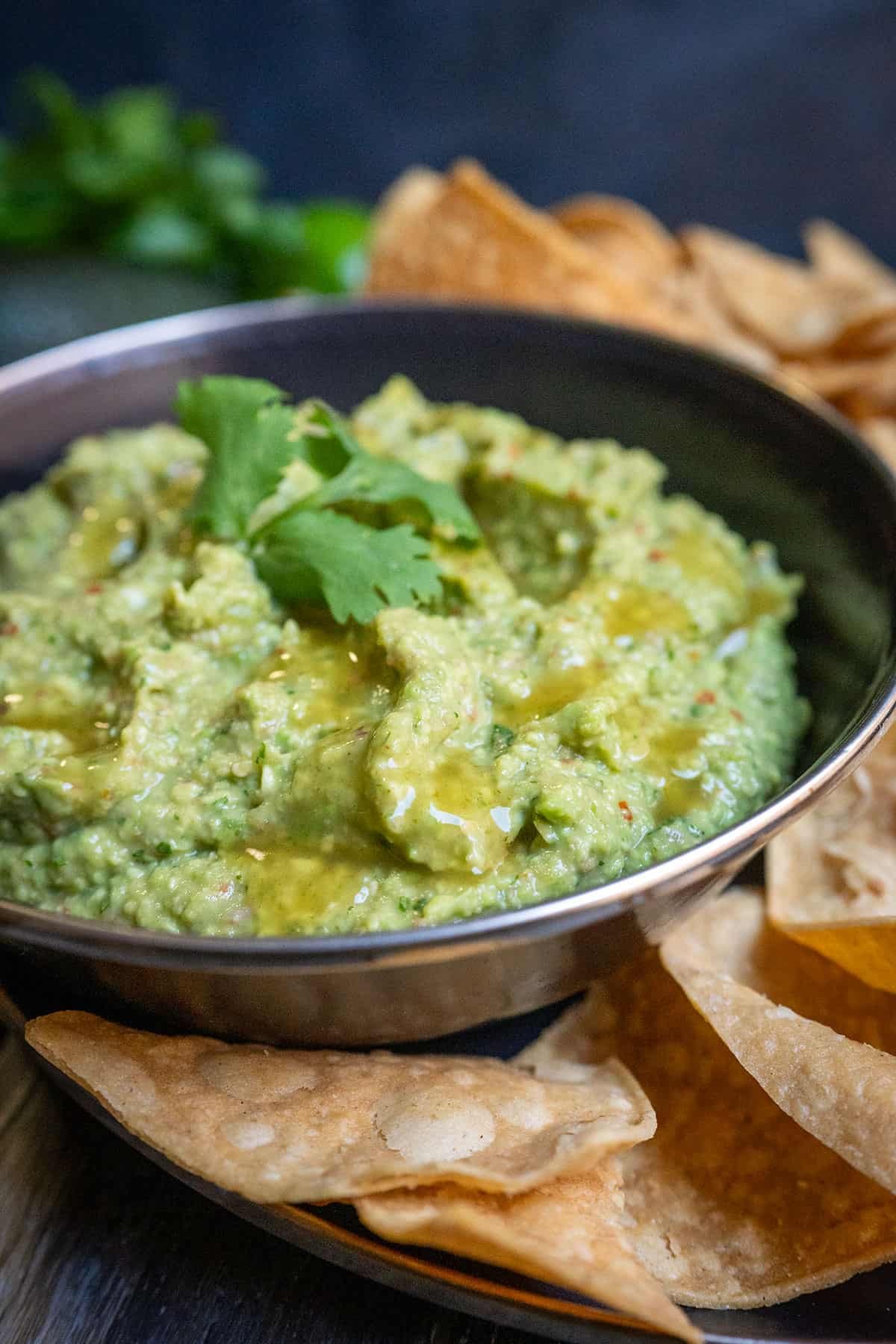 Transfer the homemade guacamole into a serving bowl. Garnish with more hot sauce and a cilantro leaf. Serve as a dip with tortilla chips or serve it along side tacos or nachos.