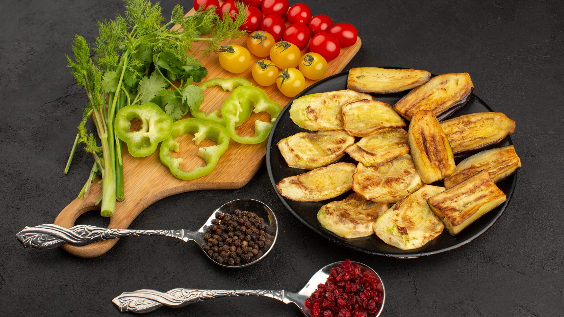 - Wash and chop the vegetables: slice the zucchini into rounds, cut the bell peppers and onion into chunks, and leave the mushrooms whole. Halve the cherry tomatoes if desired.