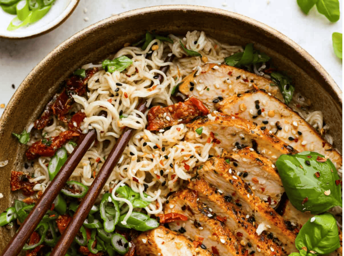 A top-down view of Marry Me Ramen with grilled chicken, sun-dried tomatoes, green onions, sesame seeds, and fresh basil. A comforting and creamy ramen dish full of bold flavors.