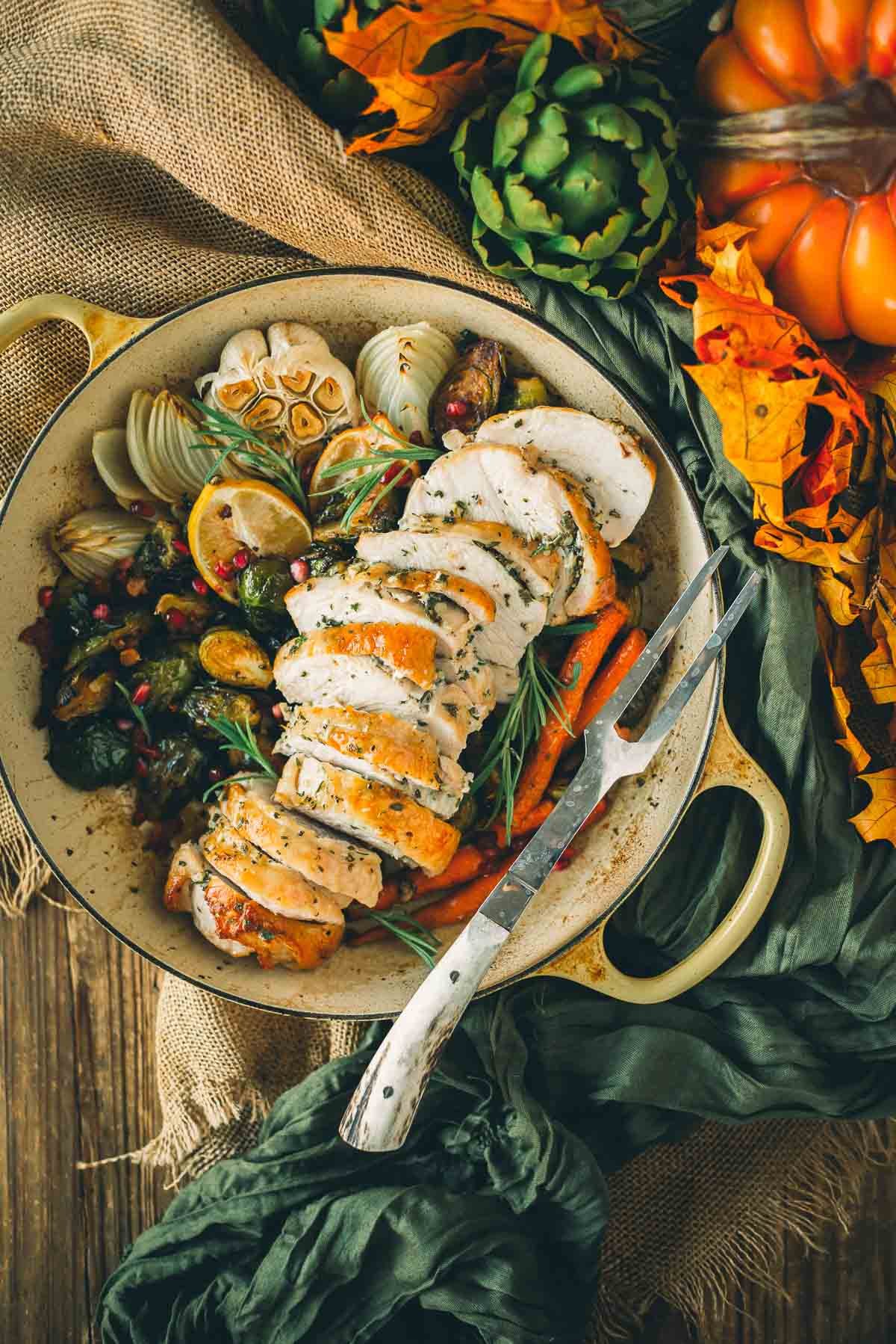 Transfer the turkey breast and veggies to a clean work surface to rest.