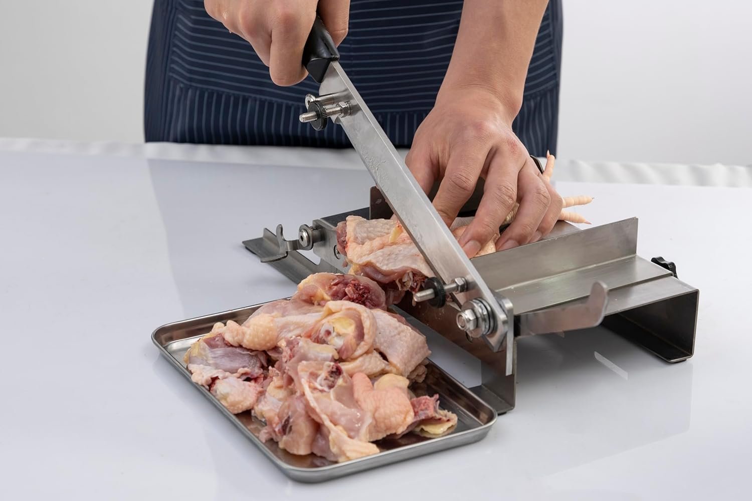 【10inch Small Size】Pay attention to this Meat slicer’s size, that steel operator area only could hold middle chicken & birds to cut,not suitable large chicken or turkey meat.