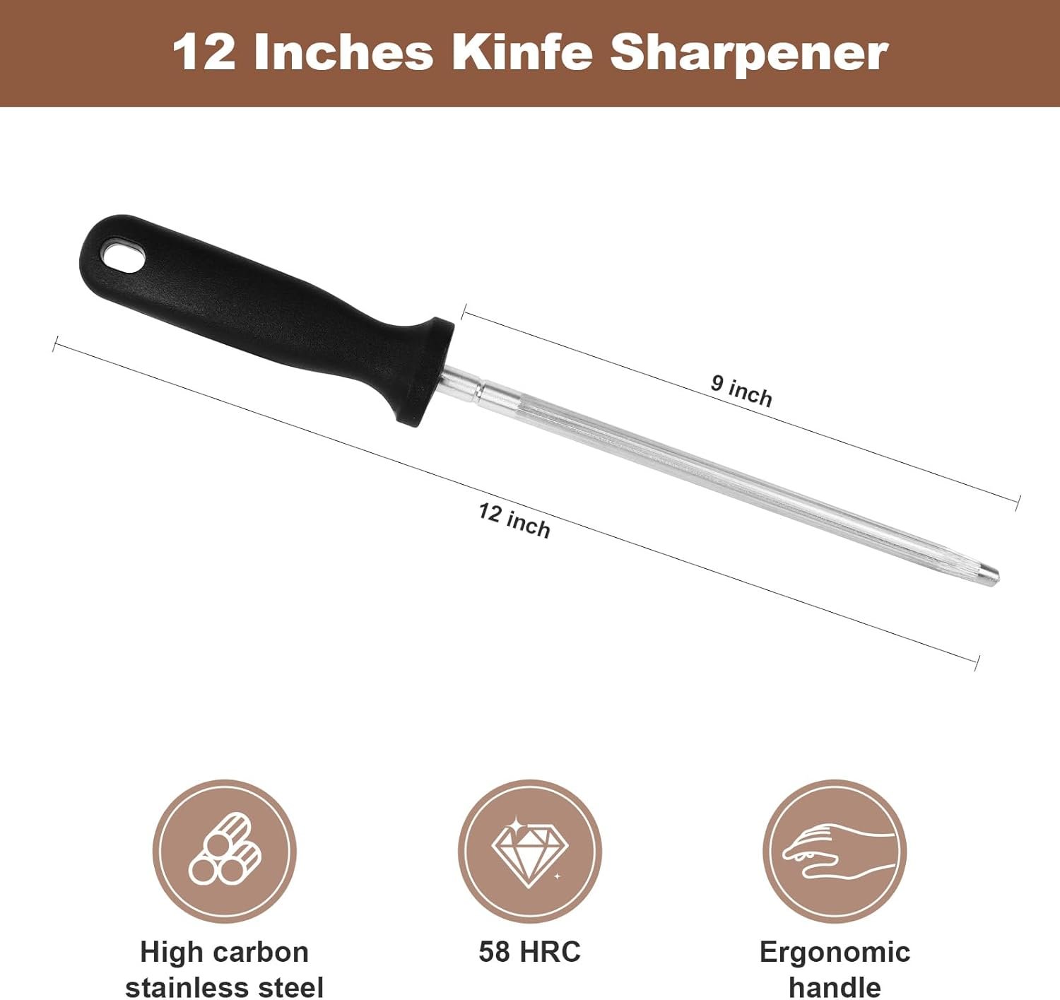 12 Inches Knife Sharpening Steel Rod, High Carbon Steel Honing Rod with 9 Inches Sharpening Steel and Ergonomic PP Handle, Premium Kitchen Knife Sharpener for Chefs and Home Cooks Use