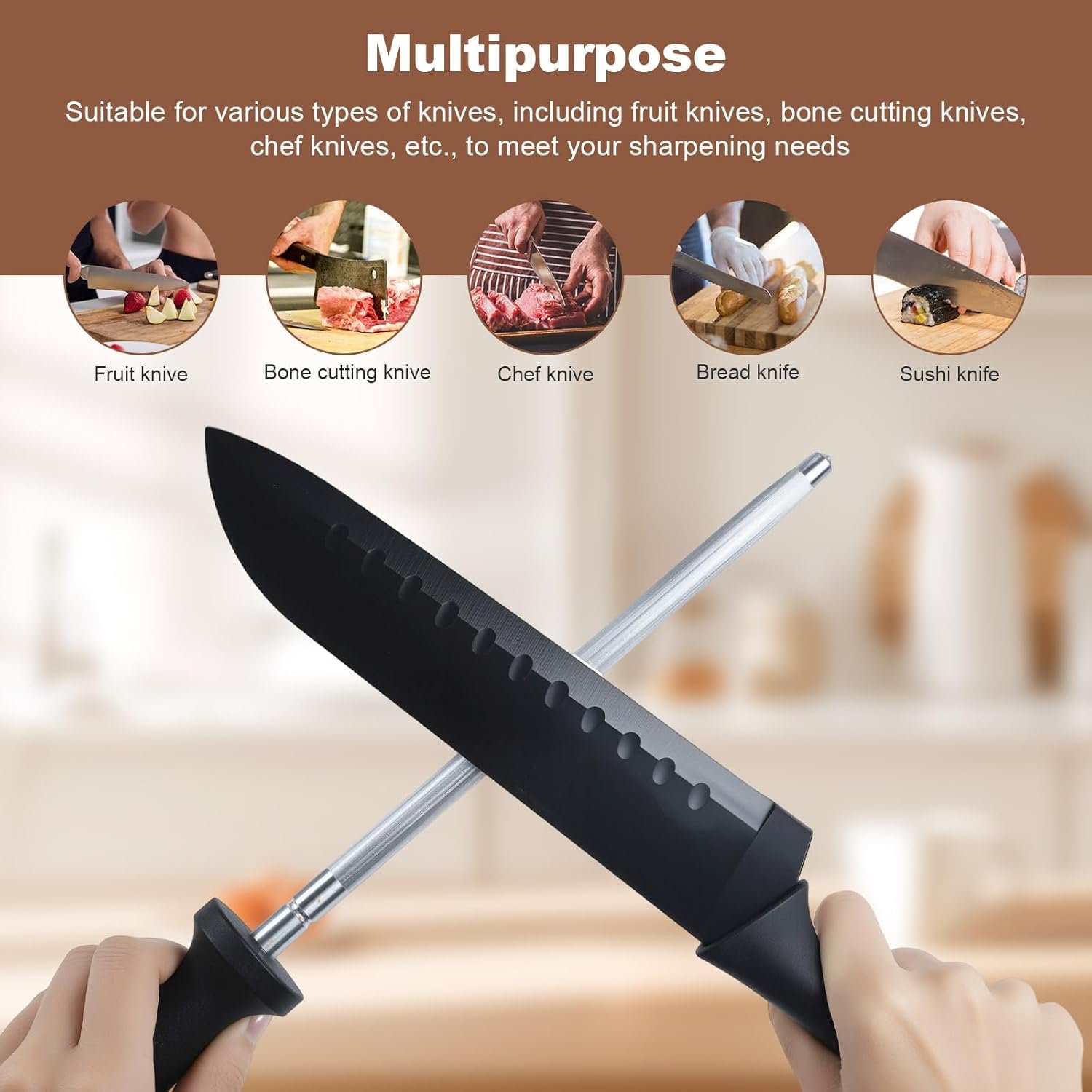 Multipurpose: Our honing steel rod are suitable for various types of knives, such as cartilage knives, bone cutting knives, small kitchen knives, fruit knives, long fruit knives, chef knives, etc., to meet your sharpening needs and make the kitchen more convenient
