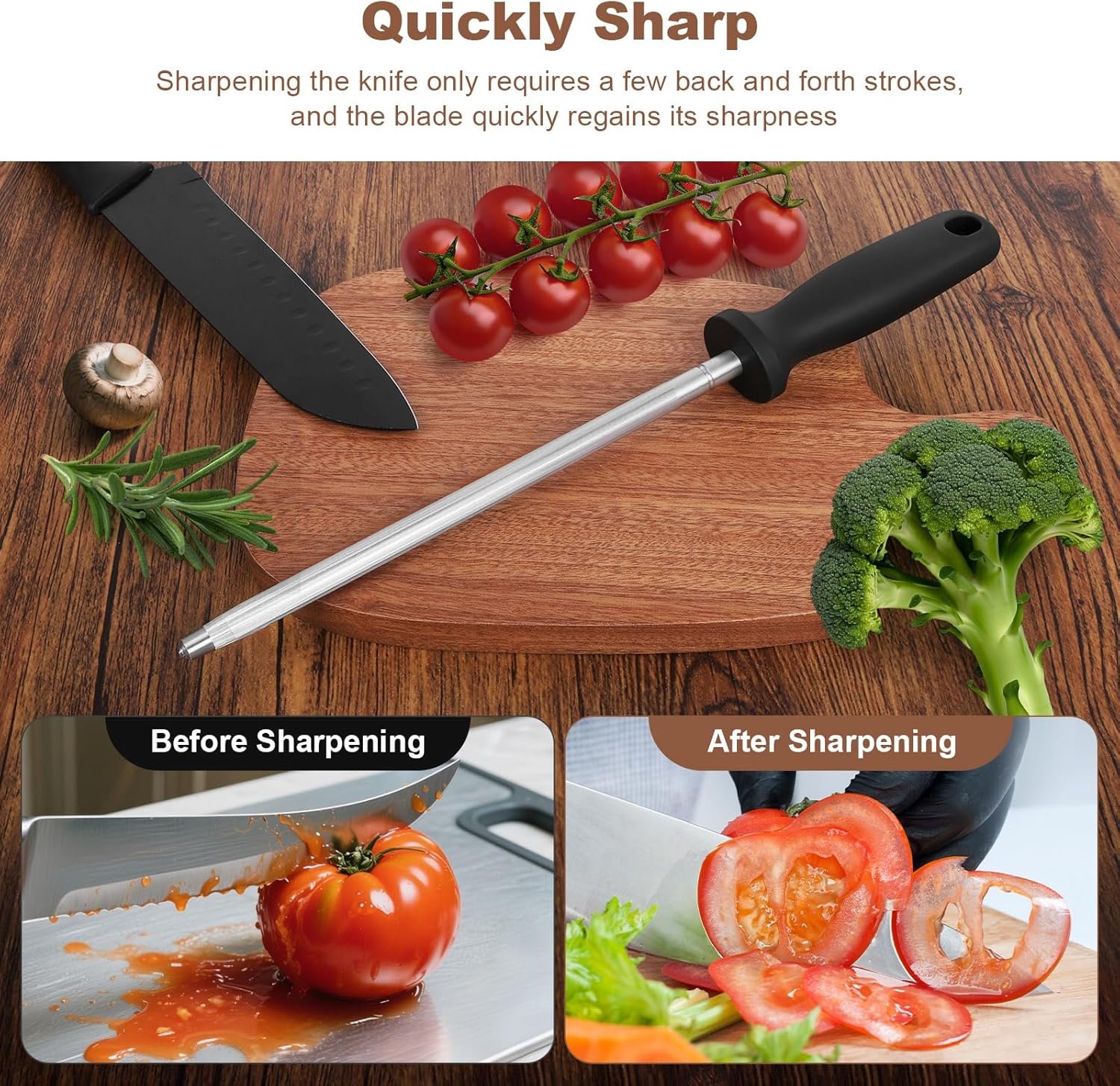 Professional Sharpening Rod: Our knife sharpening rod is the professional solution, Keeps knives razor-sharp with just a few back and forth movements on the blade sharpener