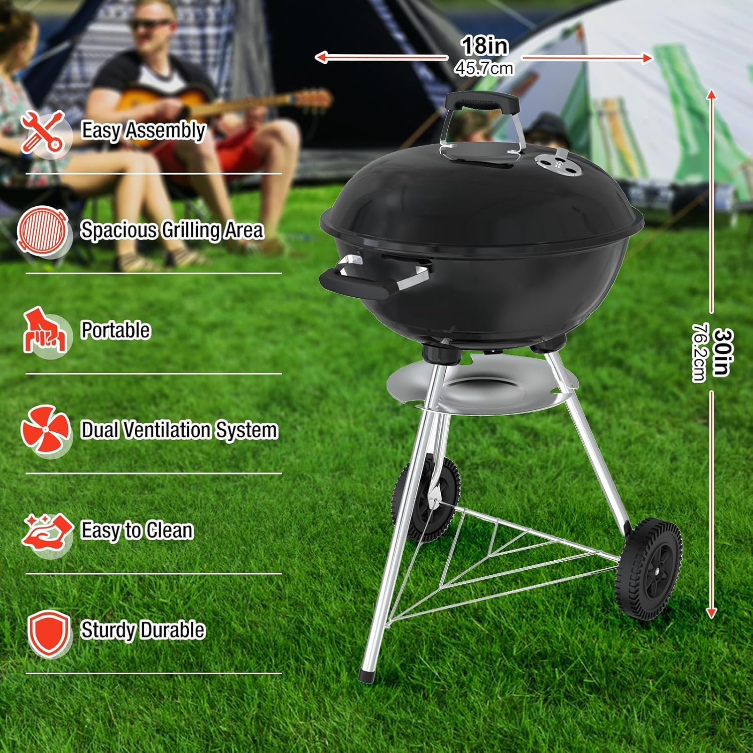 18 inch Charcoal Grill, Portable Kettle Barbecue Grills, Durable & Easy to Assemble, Round Smoker/BBQ Grill with Wheels and Lid for Outdoor Cooking, Camping, Backyard and Beach, Black