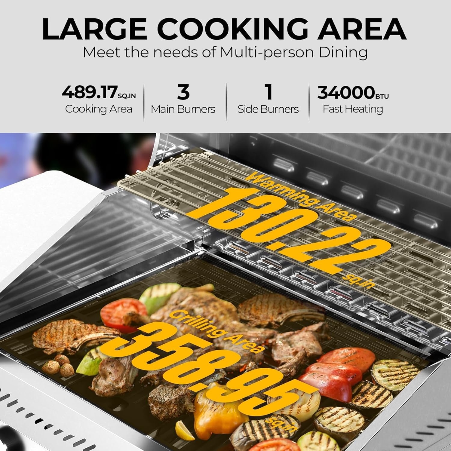 Spacious Cooking Area & Storage : Offers 489.17 sq. in. total grill space (358.95 sq. in. main grilling + 130.22 sq. in. warming area). Built-in bottle opener, side hooks for tools, and bottom storage keep everything organized.