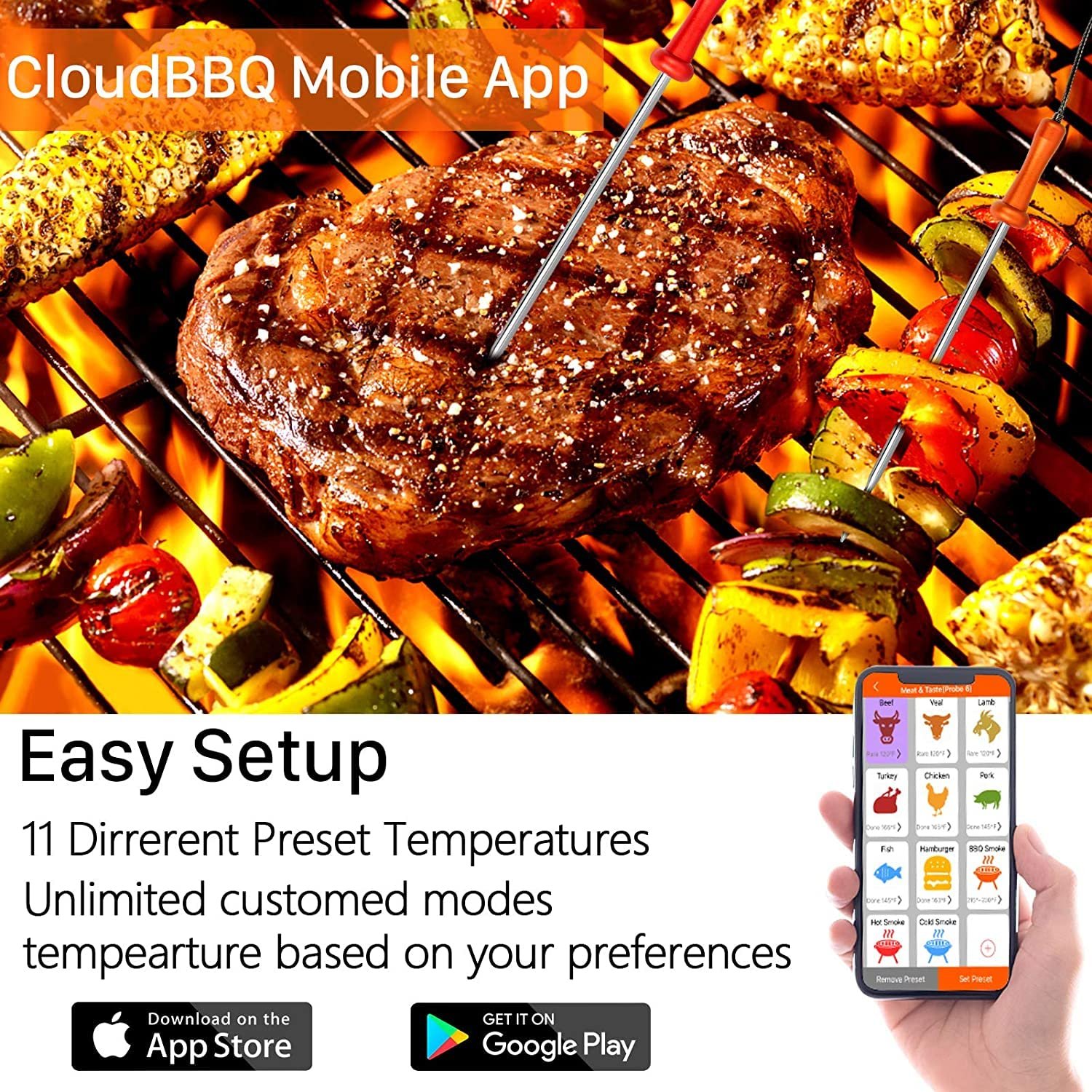 【Kitchen Timer&Temp Monitor】Reaches preset temperature ,Receiver will beep and flash ,BBQ thermometer with preset temperatures for 12 types of meat,Instant read digital display,Show your cooking temperature and record the temperature curve.