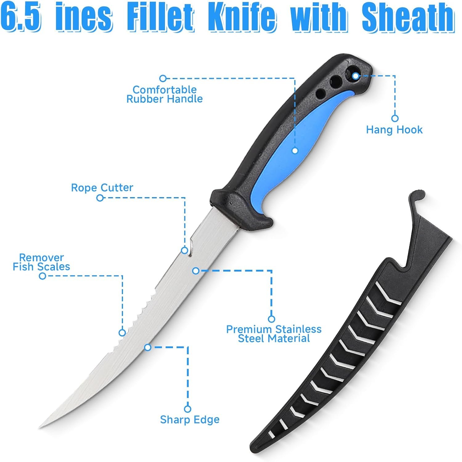 SHARP & DURABLE FILLET KNIFE: The 6.5” fillet knife features tough and corrosion-resistant 3CR13 Stainless steel, making it easy to detailed precision cutting and scaling, a super thin blade featuring a serrated edge on back side, allows for effortless remove fish scales without loss. Ergonomic handle grip with groove ensures non-slip during use, provide ultimate knife control.