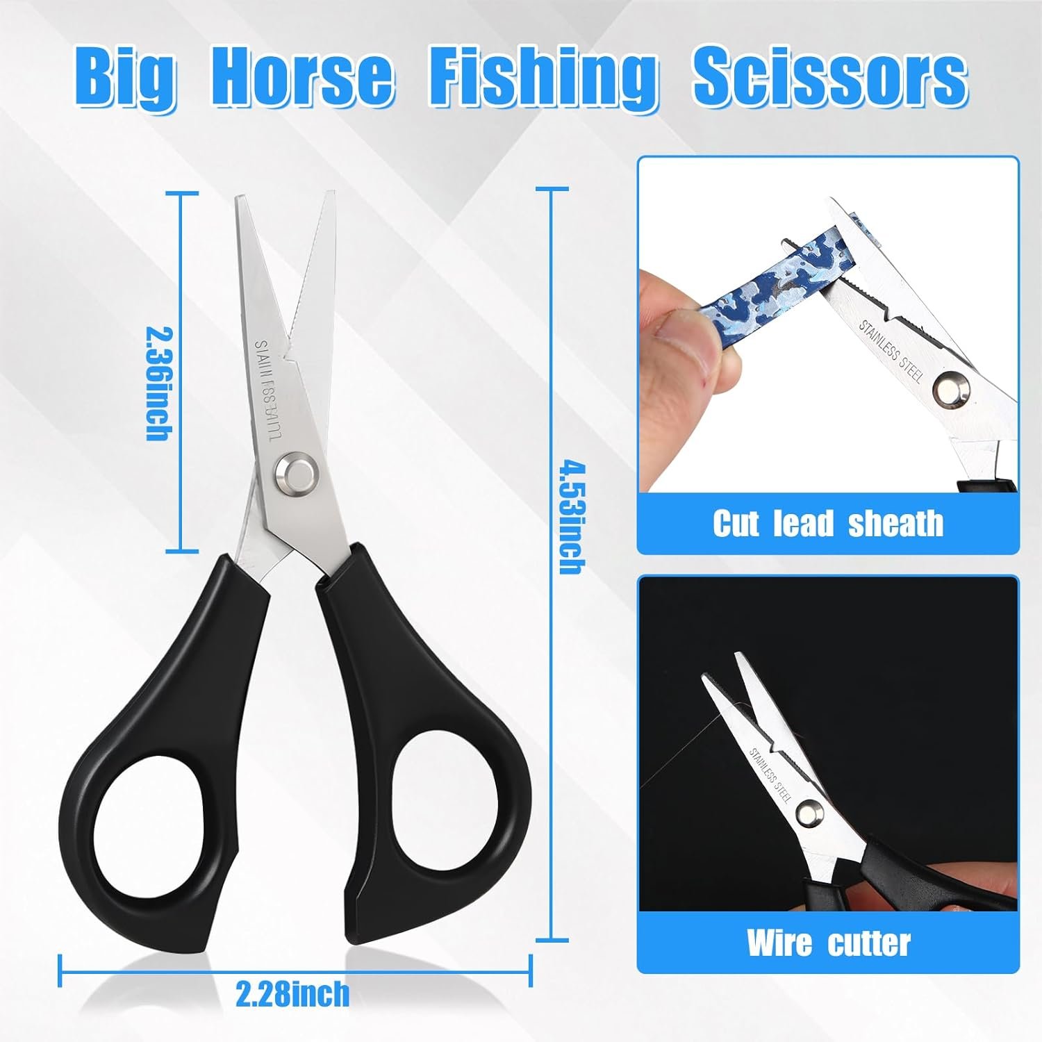 VERSATILE FISHING LINE SCISSOR: Sharp fish scissors or clippers fetures precision ground micro-serrated blade, easily cuts through lead sheet and various types of fishing line: monofilament, and fluorocarbon fishing lines, braid or PE fishing line from 5 to 100lbs. This fish line cutter is made of stainless steel anti-seawater corrosion material, ergonomic handle and easy to handle.