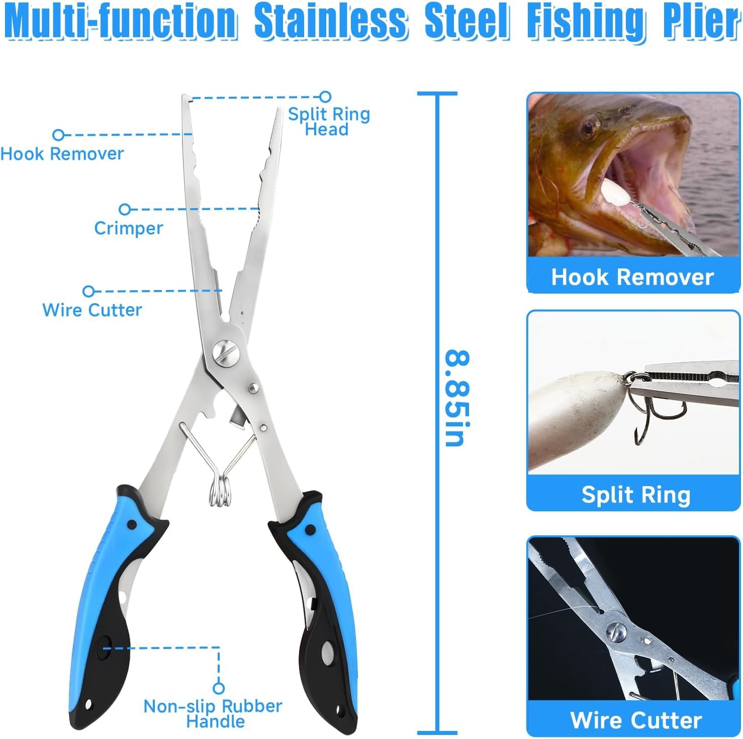 VERSATILE FISH PLIERS: Multi-purpose pliers feature Split Ring Head, Hook Remover, Wire Strippers, Crimper, Wire Cutter for ordinary nylon fishing wire, carbon wire or iron wire. Three crimping slots are designed for different types of leads. Quickly remove hook or replace treble hook on your lure while catching fish or utilize the carbide cutters to cut fishing line or other fishing tasks. Non-slip grip handle avoids pliers slipping. Fish plier overall length: 8.85 inches.
