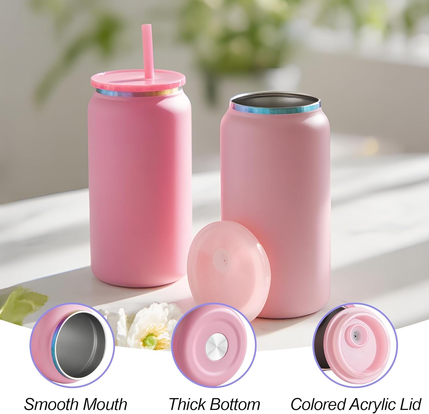 6 Pack Glass Cups with Lids and Straws Unbreakable 16 oz Stainless Steel Can Cup Double Wall Insulated Beer Can Tumbler for Iced Coffee, Juice, Soda, Matte-Colored