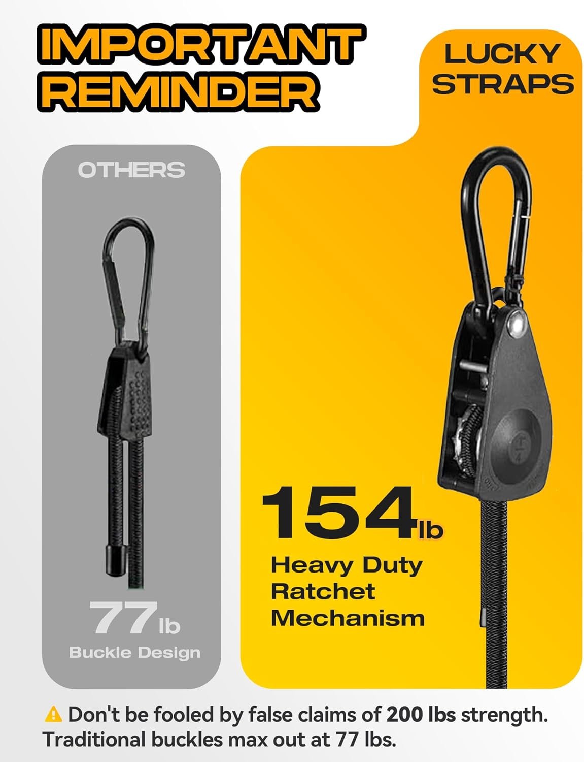 IMPORTANT NOTICE: Traditional buckle designs have a maximum load capacity of 77 lbs. Only adjustable carabiner bungee cords with a ratchet mechanism can reach a 154 lbs break strength. Don’t be misled by false claims of 200 lbs strength. To protect your cherished items from damage, choose our heavy-duty adjustable carabiner bungee cords with a ratchet mechanism.