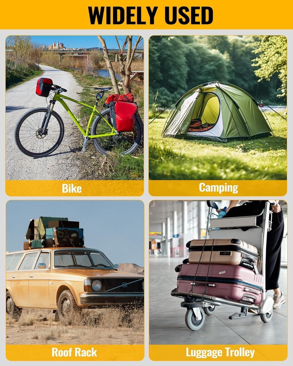 EXCELLENT UV RESISTANCE – We wrap the rubber with high-strength and durable polyester which will hold up well under direct sunlight, while other similar products use regular nylon or polypropylene which will start to degrade if exposed to sunlight. Therefore, our bungee cords are more UV-resistant and durable. Great for camping, tarps, tents, bike racks, and luggage, etc.
