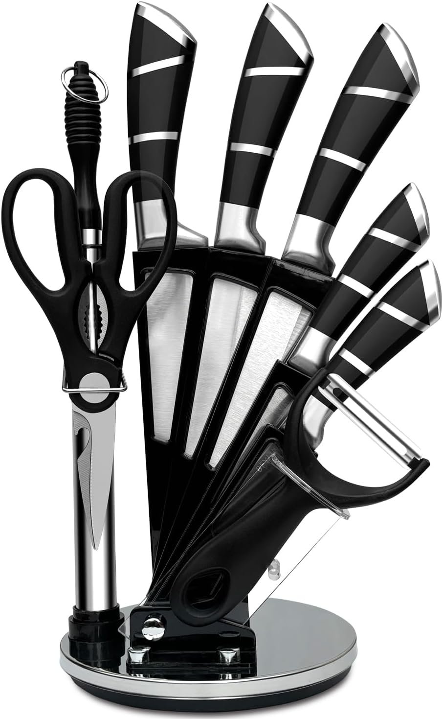 【9 Pieces Knife Set】 9 pieces knife set includes: 8″ Chef knife, 8″ Slicing knife, 8″ bread knife, 5″ Utility knife, 3.5″ Paring knife, kitchen shear, sharpener steel ,peeler, and Knife Block.