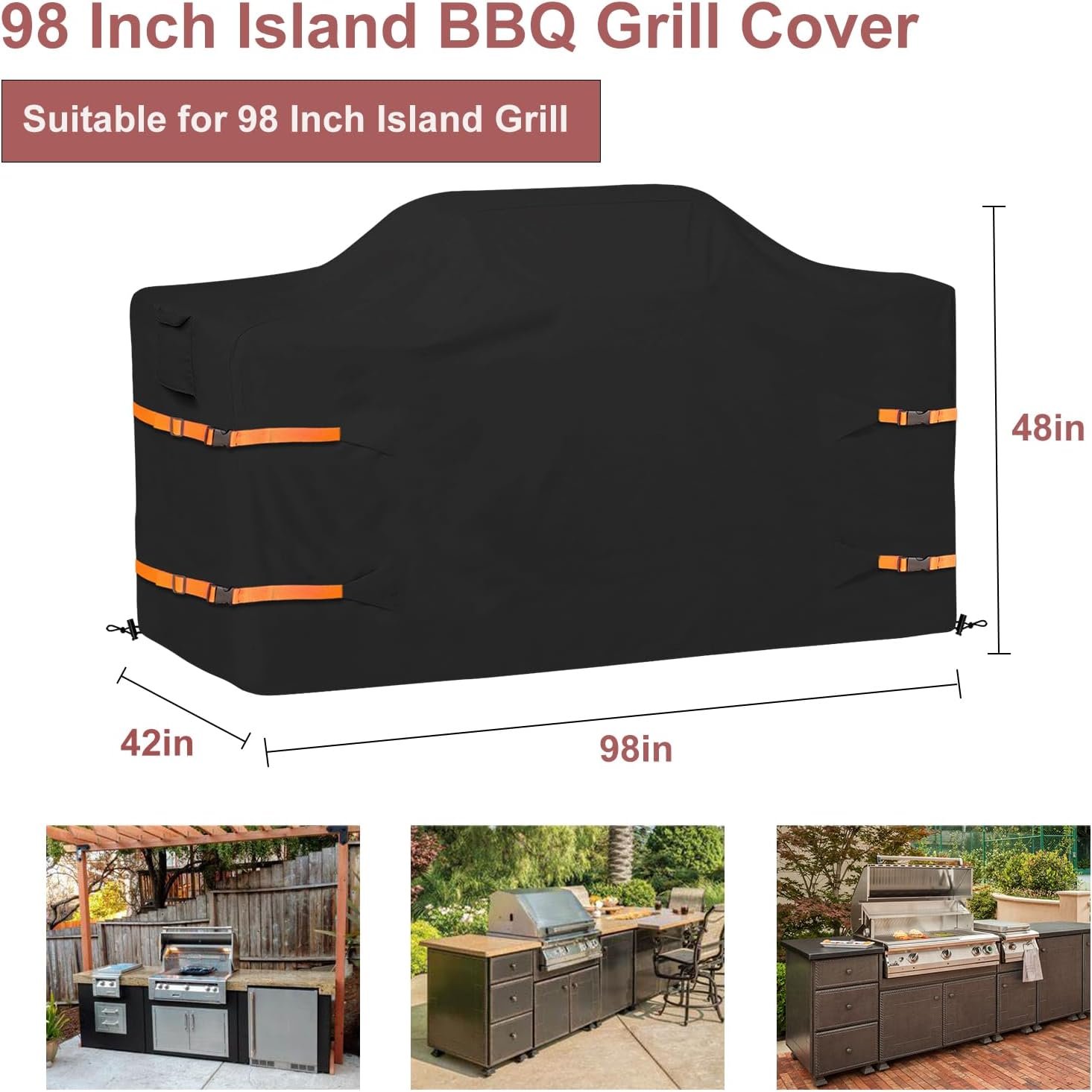 Island Grill Cover Size:Fits center island BBQ grills that are 98”L x 42”W x 48”H outdoor Grill Cover,Please confirm the size of your before purchasev.Gift-Orange Adjustable Buckle x4.