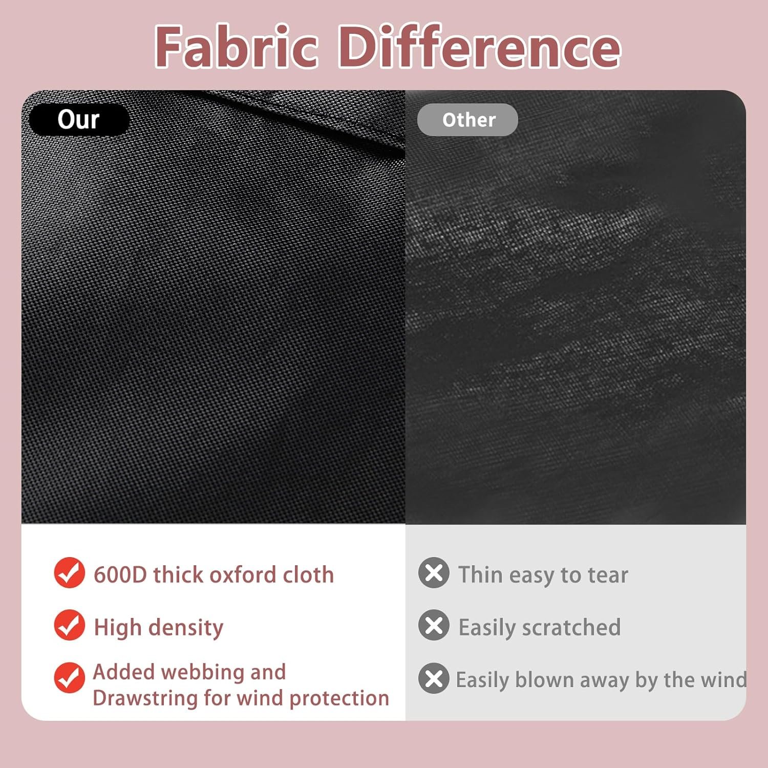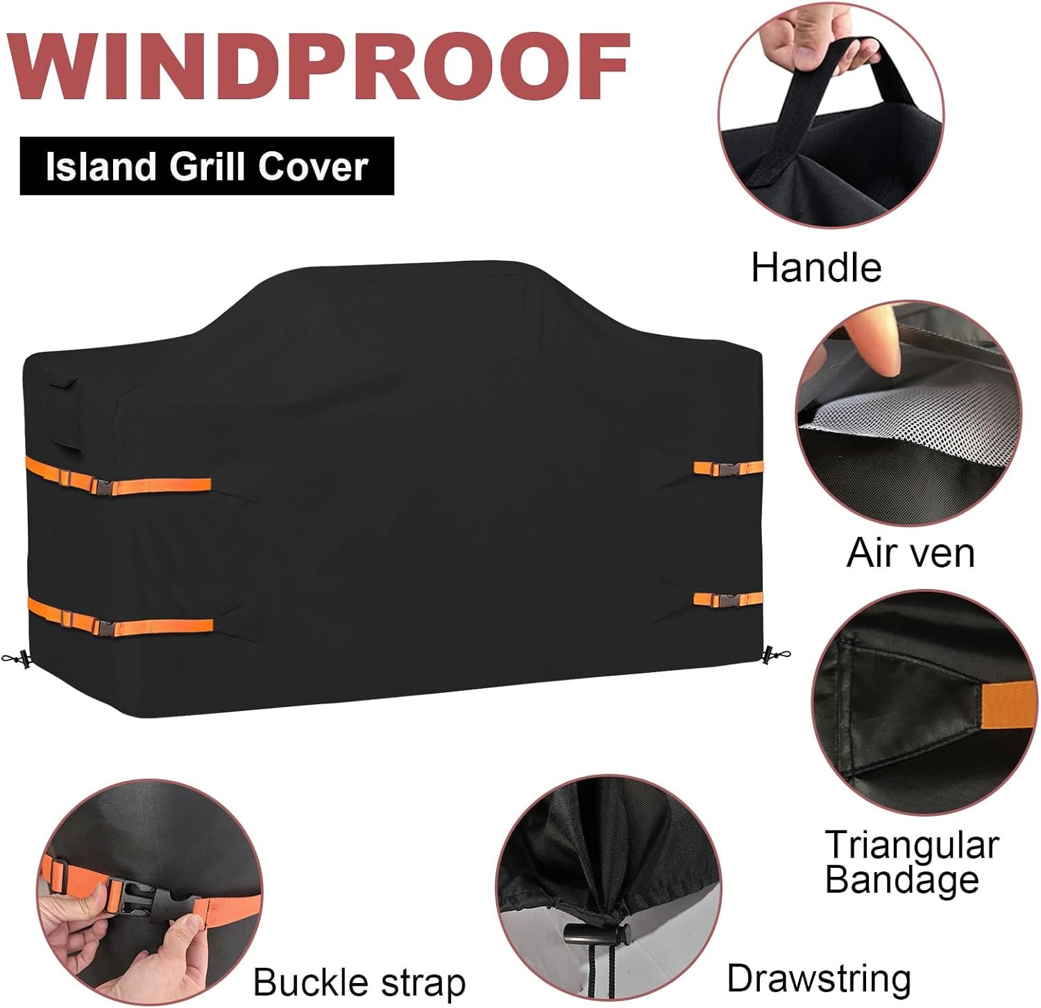 Detail Design: 2 Padded handles make easy fitting and removal. 2 air vents reduce inside condensation and wind lofting. Equipped with 4 windproof buckles and 2 adjusting drawstring to securely tie up the island grill, and prevent it from being blown up by the wind.