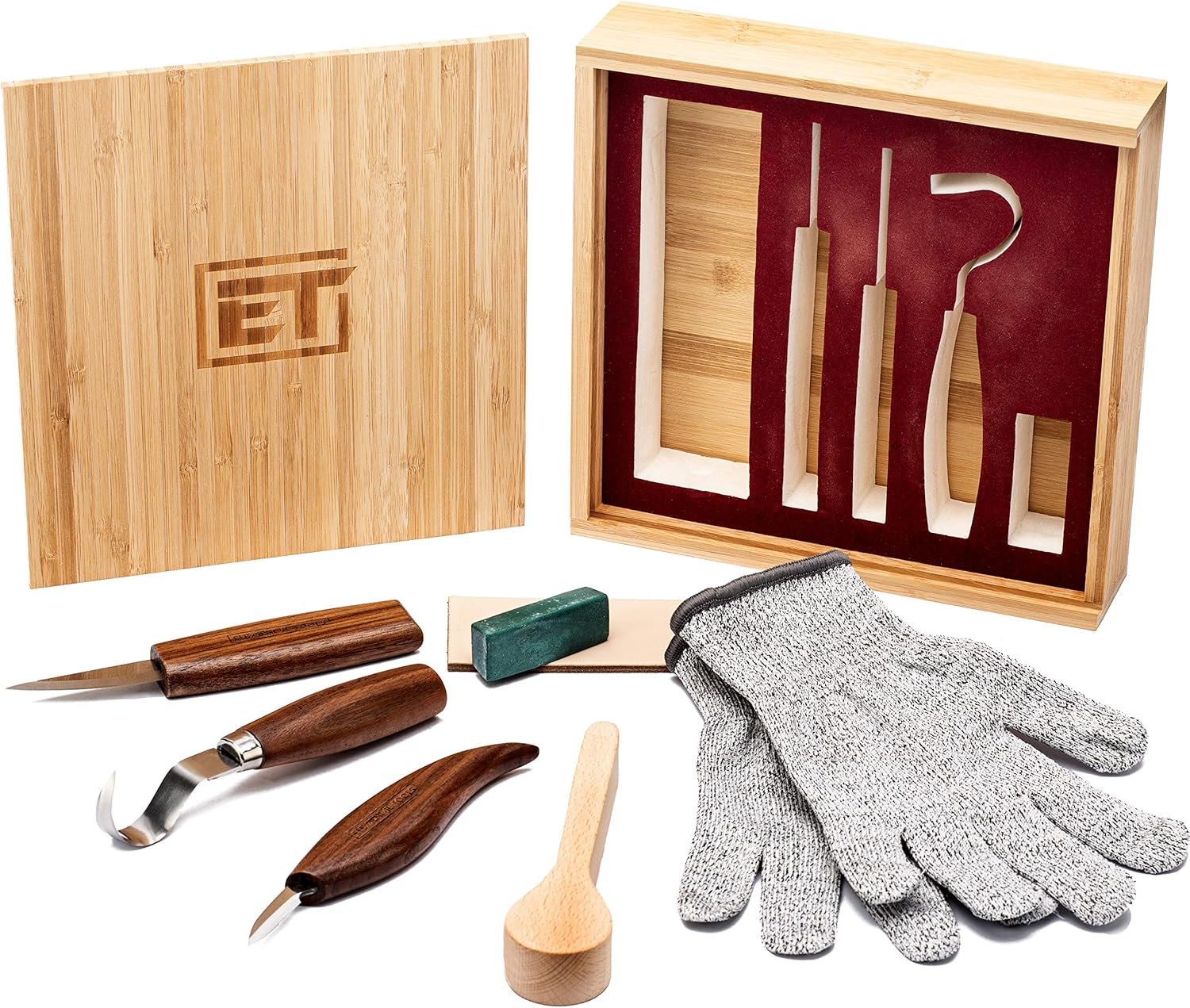 9pc Wood Carving Tools Set – Hook Carving Knife, Whittling Knife, Detail Wood Carving Knife For Spoon, Bowl, Kuksa Cup Or General Woodwork – Bonus Cut Resistant Gloves And Bamboo Box