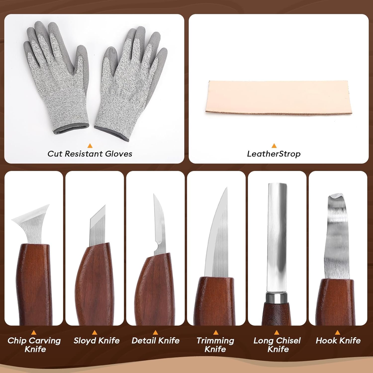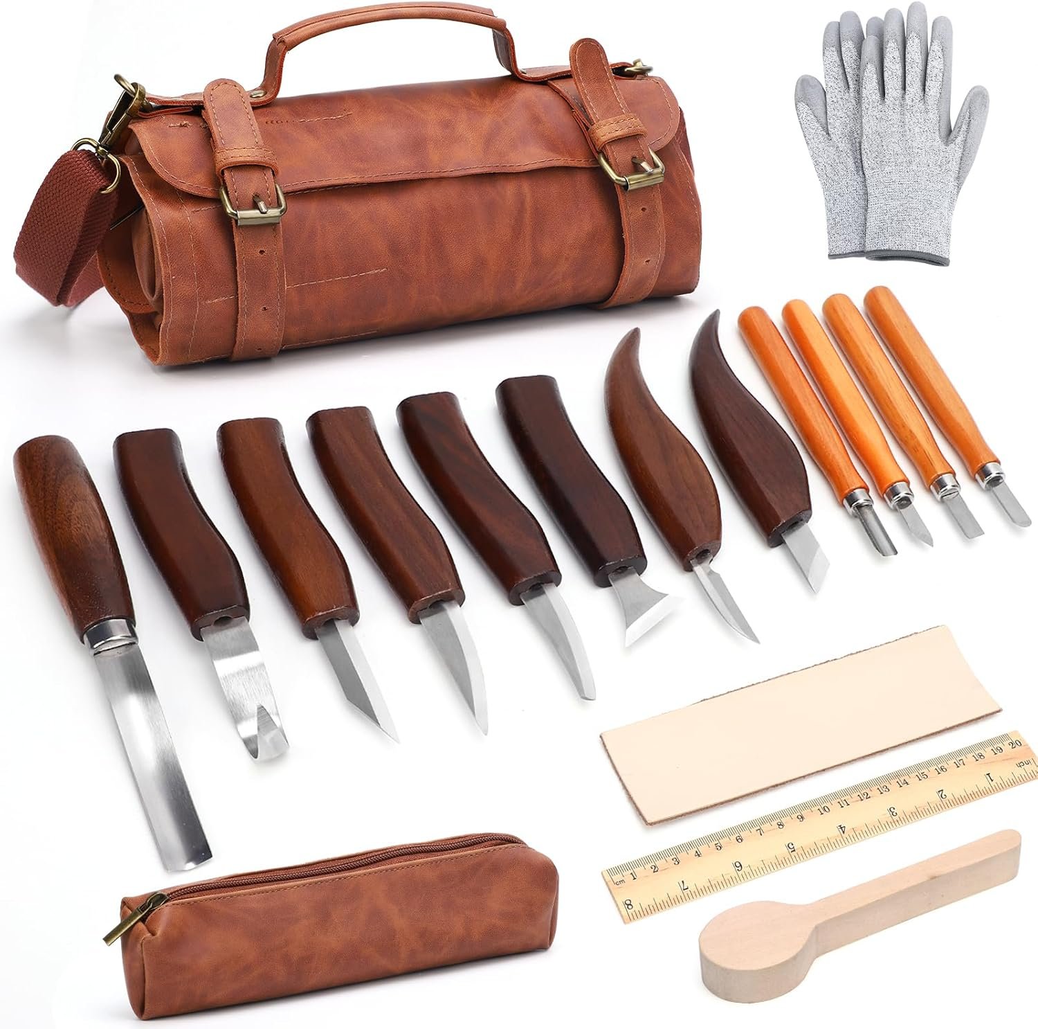 【15-Piece Wood Carving Kit 】 This wood carving kit includes 8 whittling knives, 4 detail carving knives, gloves, sharpening belts, and a leather storage roll, making it perfect for beginners and expert woodworkers alike. 【Whether you’re crafting intricate designs or simple whittling projects, this set provides all the essential tools you need.