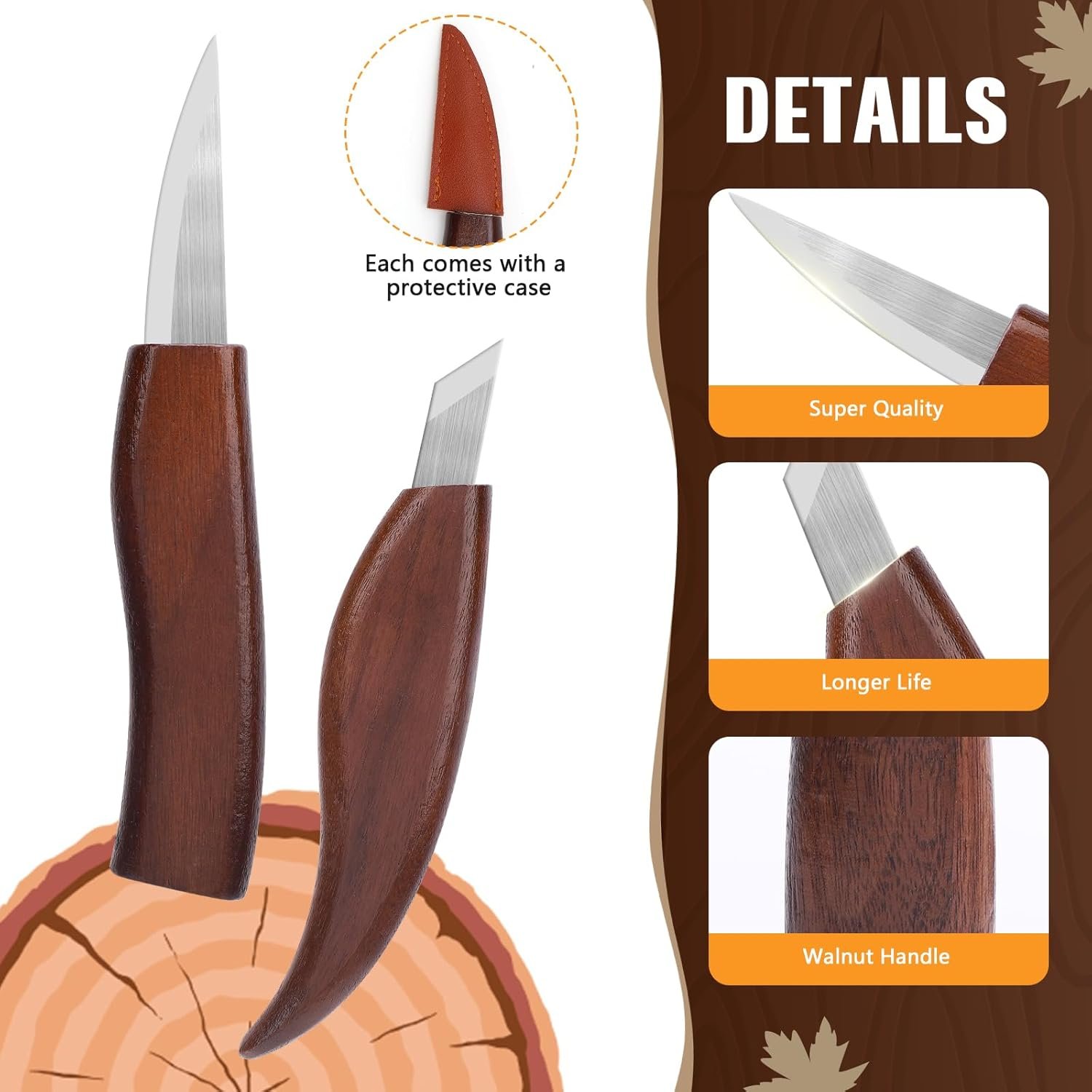 【Ergonomic Walnut Handle for Comfort & Control 】 Designed for extended use, the wood whittling kit features handcrafted walnut handles that provide a comfortable grip and superior control. The ergonomic design reduces hand fatigue, making intricate carving easier and more enjoyable.