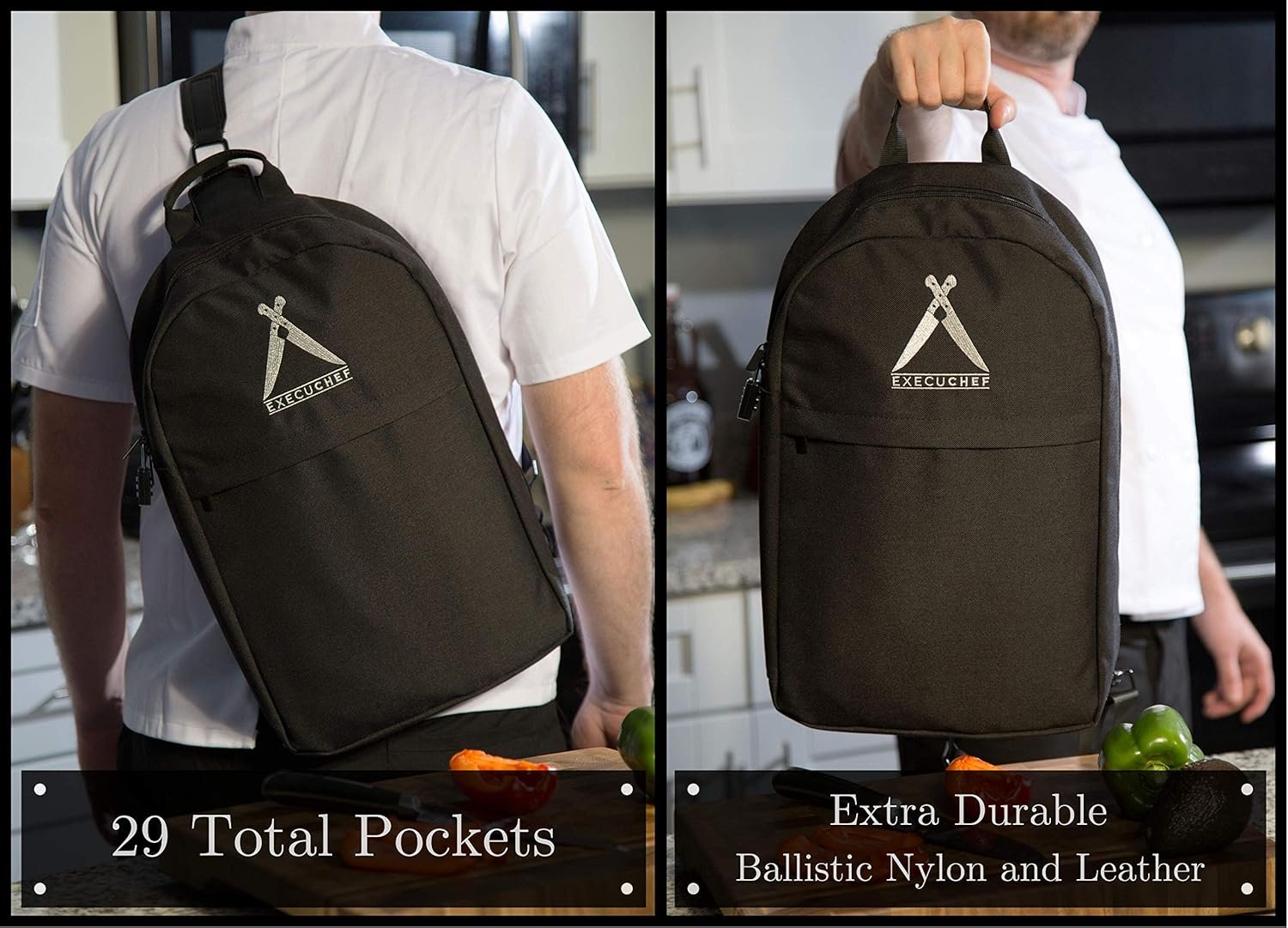 Asaya Chef Knife Sling Bag – 29 Pockets for Knives and Kitchen Utensils – Business Card Holder and Lock – Water Resistant and Durable Ballistic Nylon Backpack for Chefs