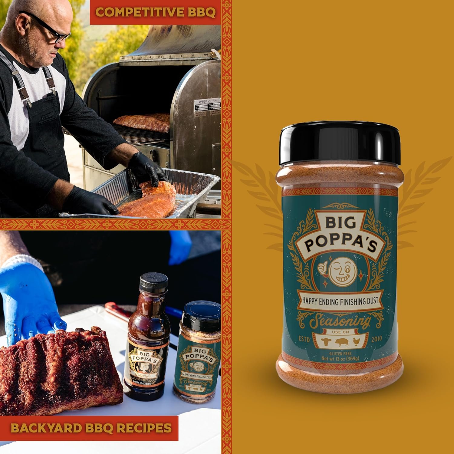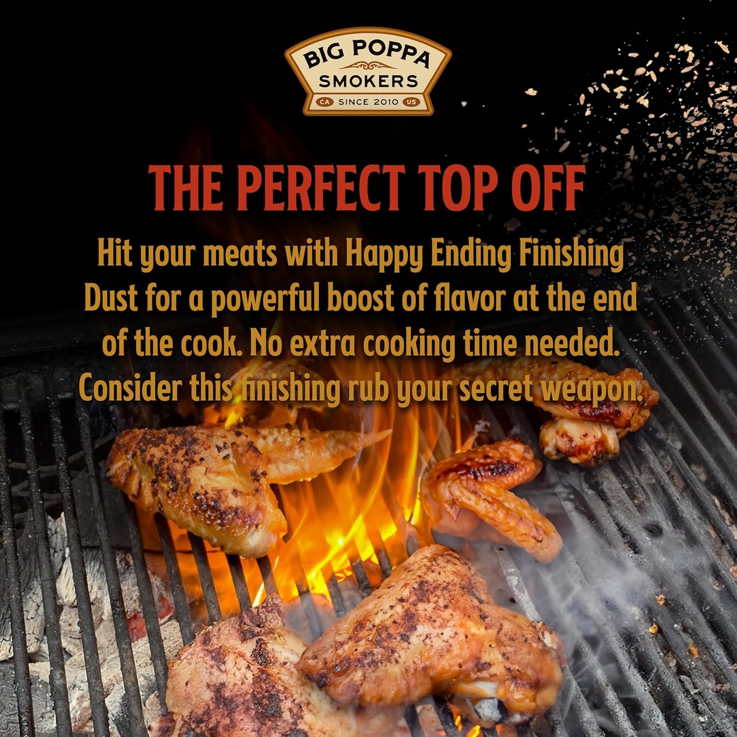 Elevate Your Grill Game: Big Poppa’s Happy Ending Finishing Dust Seasoning is the secret to BBQ triumph. Born from BBQ competition expertise, it is the secret weapon trusted by BBQ professionals. Unlock a blue ribbon-winning secret in your own kitchen and elevate your grilling experience with this meat seasoning.