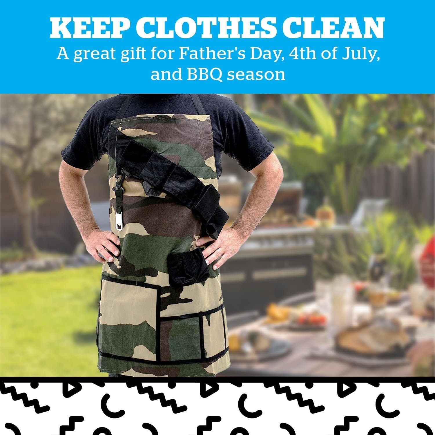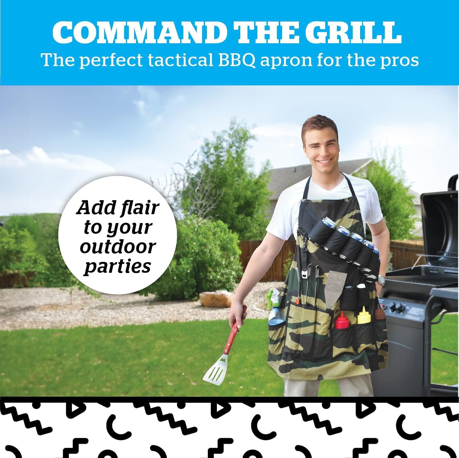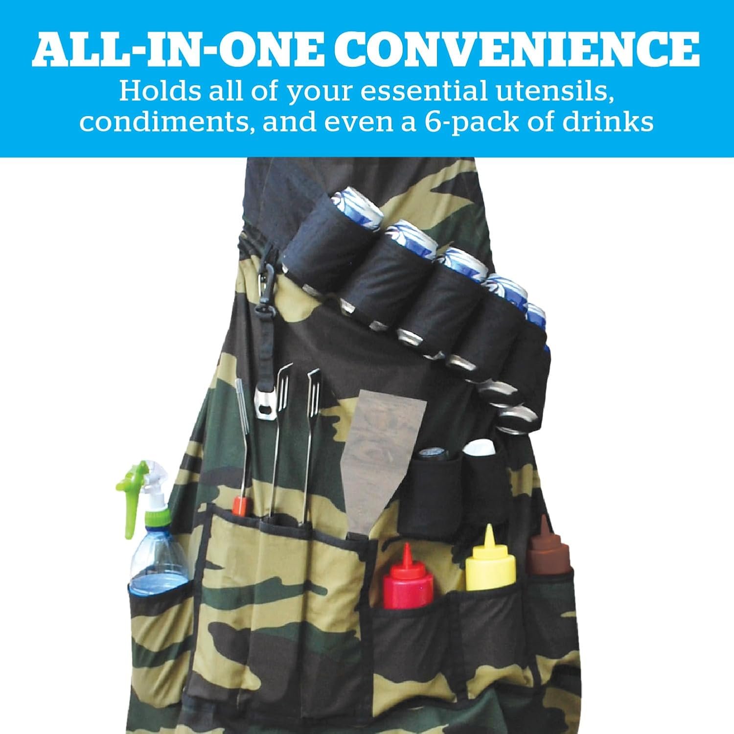 Camouflage Design: This camo grilling apron is designed to hold everything a grill sergeant could want: beer cans, cooking tools, and condiments. It’s the ultimate accessory for any grill master.