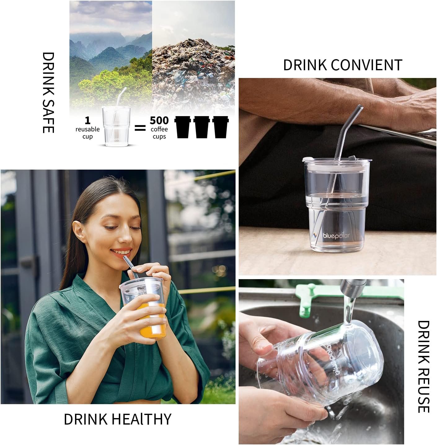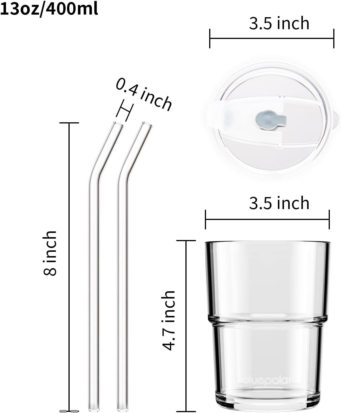 BLUEPOLAR 13oz/400ml Tumbler Water Glass, Iced Coffee Cups with Straw and Lid