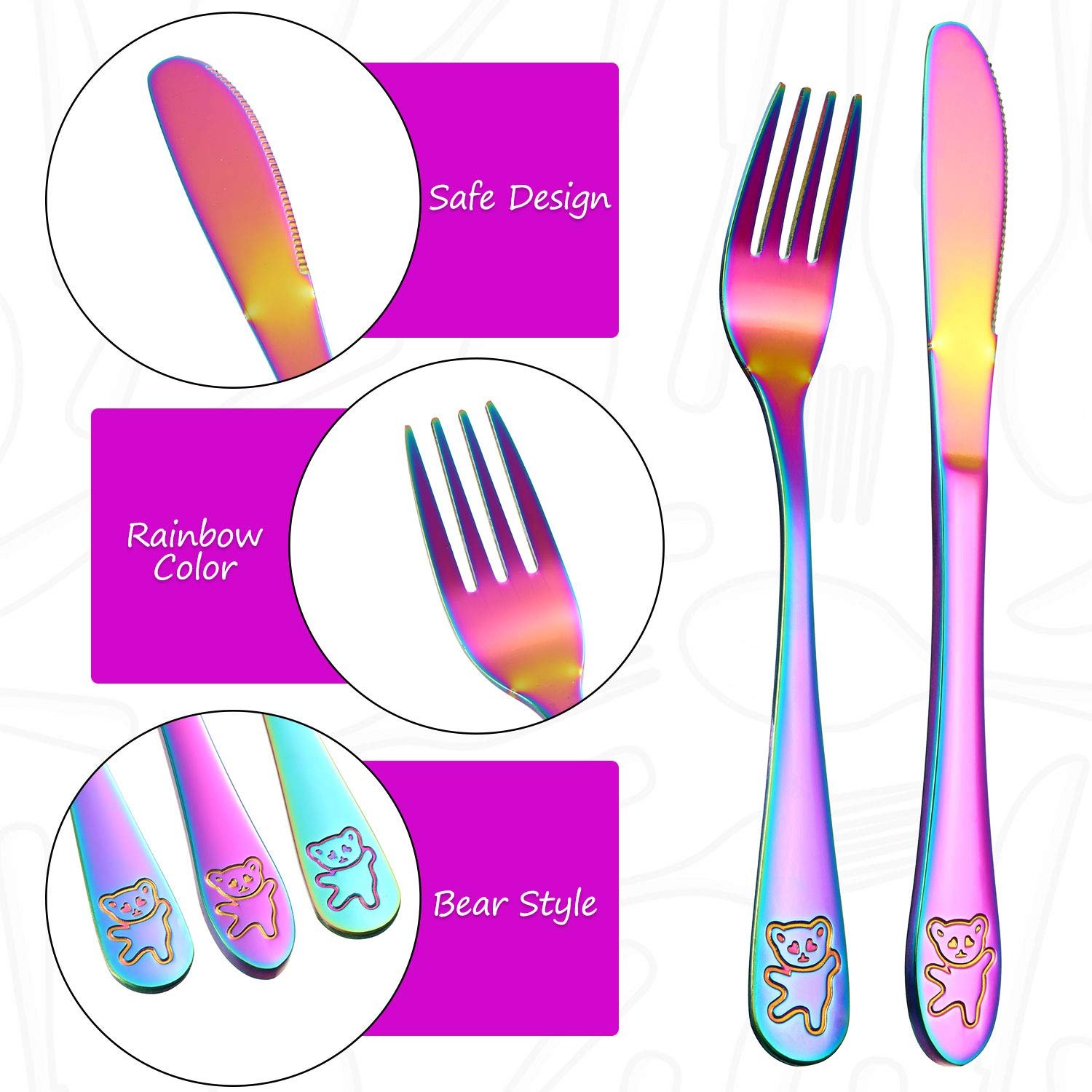 Fit most hand: each rainbow spoon is 6.6 inch/ 16.8 cm, knife measures 6.7 inch/ 17 cm, and fork comes in 6.5 inch/ 16.5 cm, proper size to suit small hands; Finished with fine polishment, the smooth edge has no burrs, which will not hurt child’s lips and hands