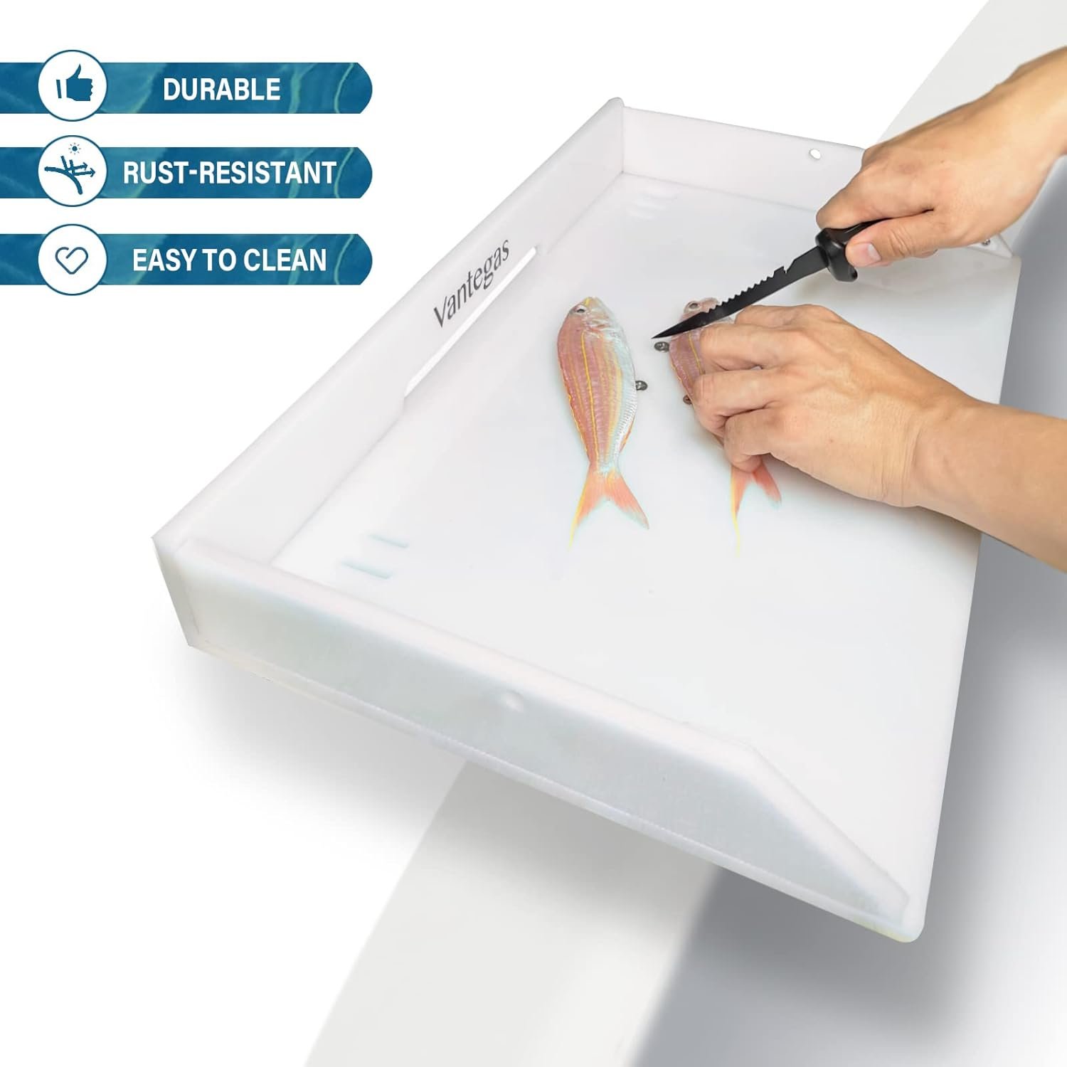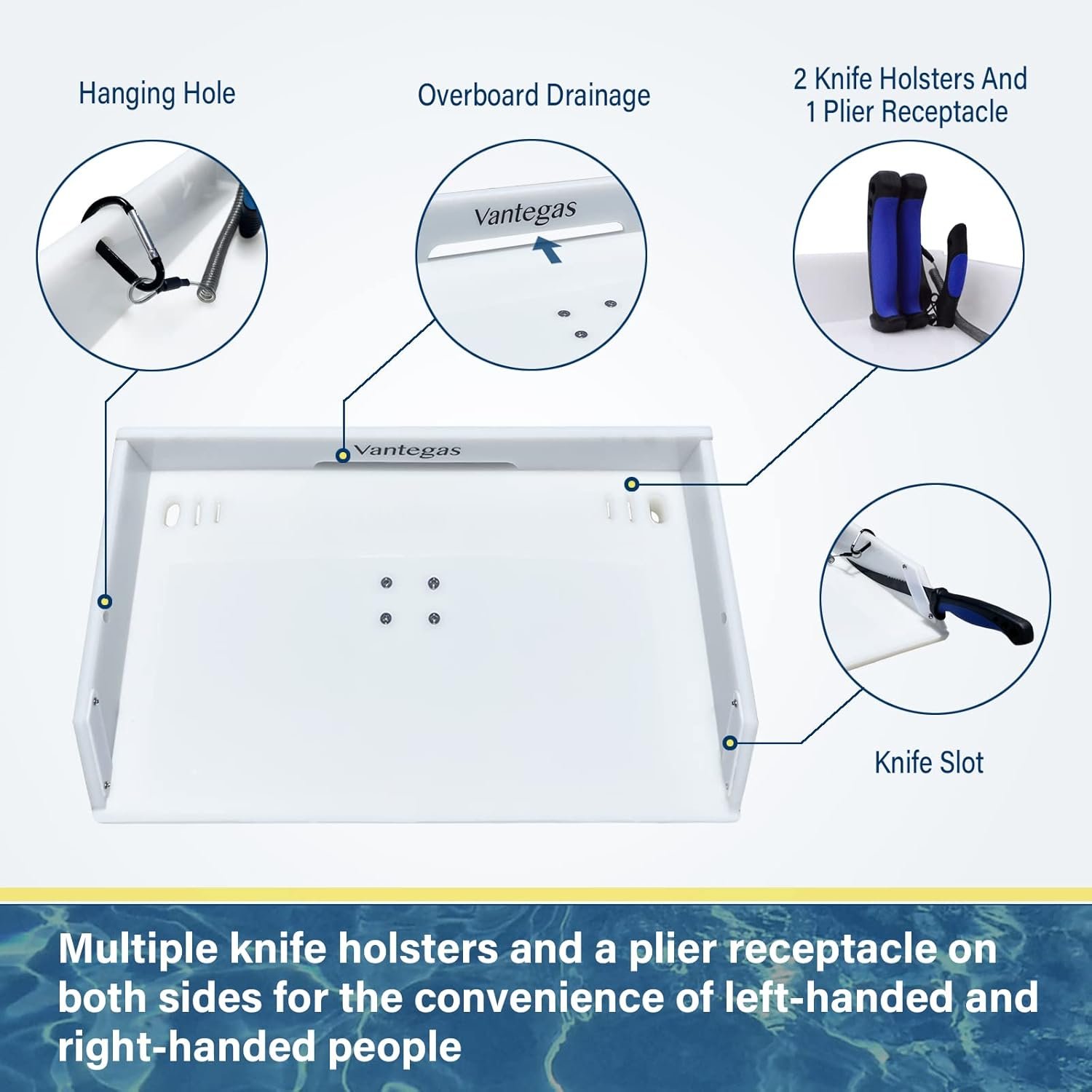 For the convenience of left-handed and right-handed users, the Cutting Board is provided with multiple knife holsters and a plier receptacle on the left and right sides. Our cutting board has a slot on the back to allow overboard drainage, keeping your work surface clean and free of any residue. There is a hanging hole on the side to hang a hook to ensure that the tools will not fall into the sea.