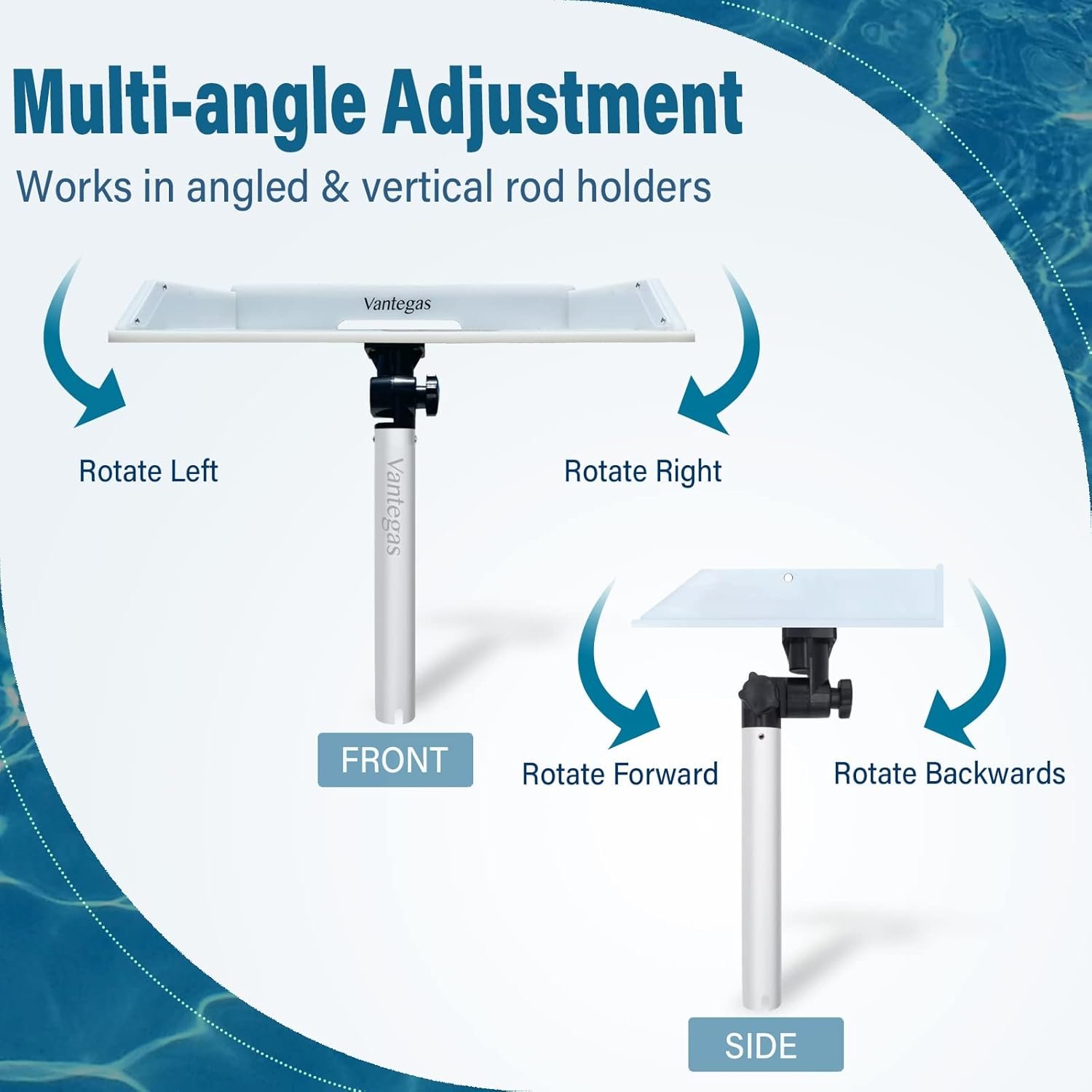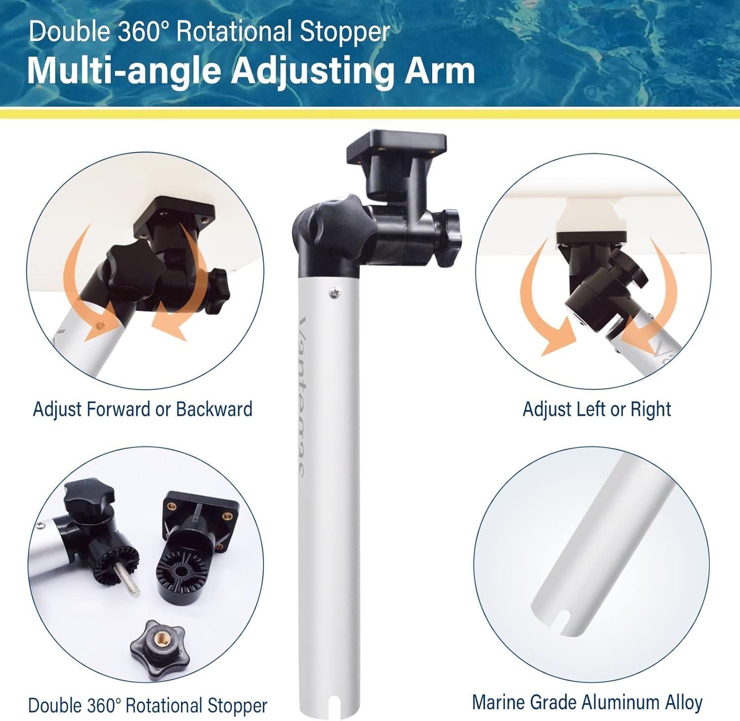 Multi-angle Adjusting Arm is composed of unique Double 360° Rotational Stopper and Aluminum Alloy Arm. The Aluminum Alloy Arm is made from high quality marine grade aluminum alloys, durable and rust-resistant, that can be really water-proof and anti-corrosion for longer time, with Double 360° Rotational Stopper, fits most cross-pin type fishing rod holders.