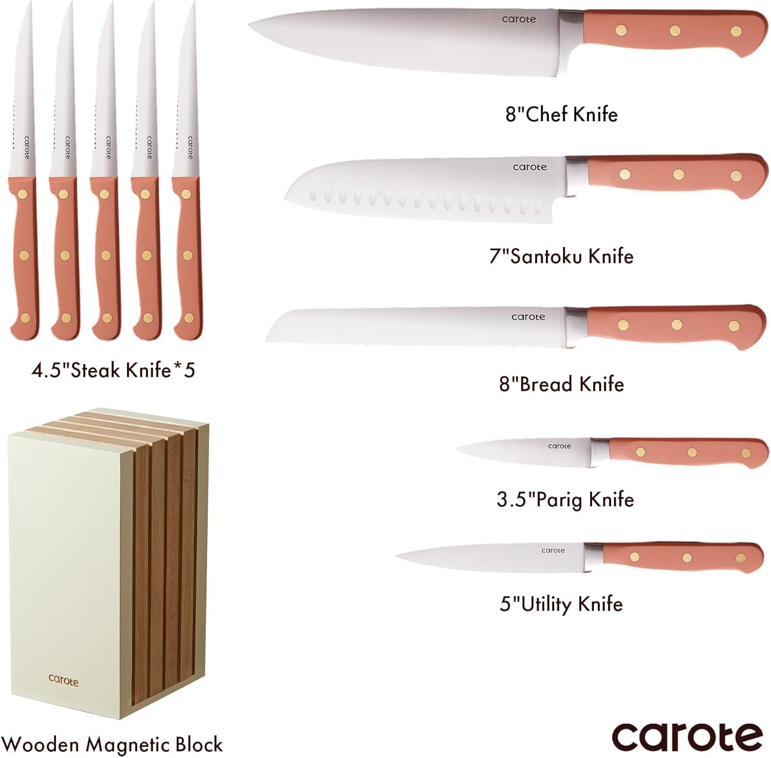 CAROTE Knife Set with Block includes all the most common kitchen knives, 8″ chef knife, 8″ bread knife, 7″ santoku knife, 5″ utility knife, 3.5″paring knife, as well as a five-piece steak knife set, wooden magnetic block.