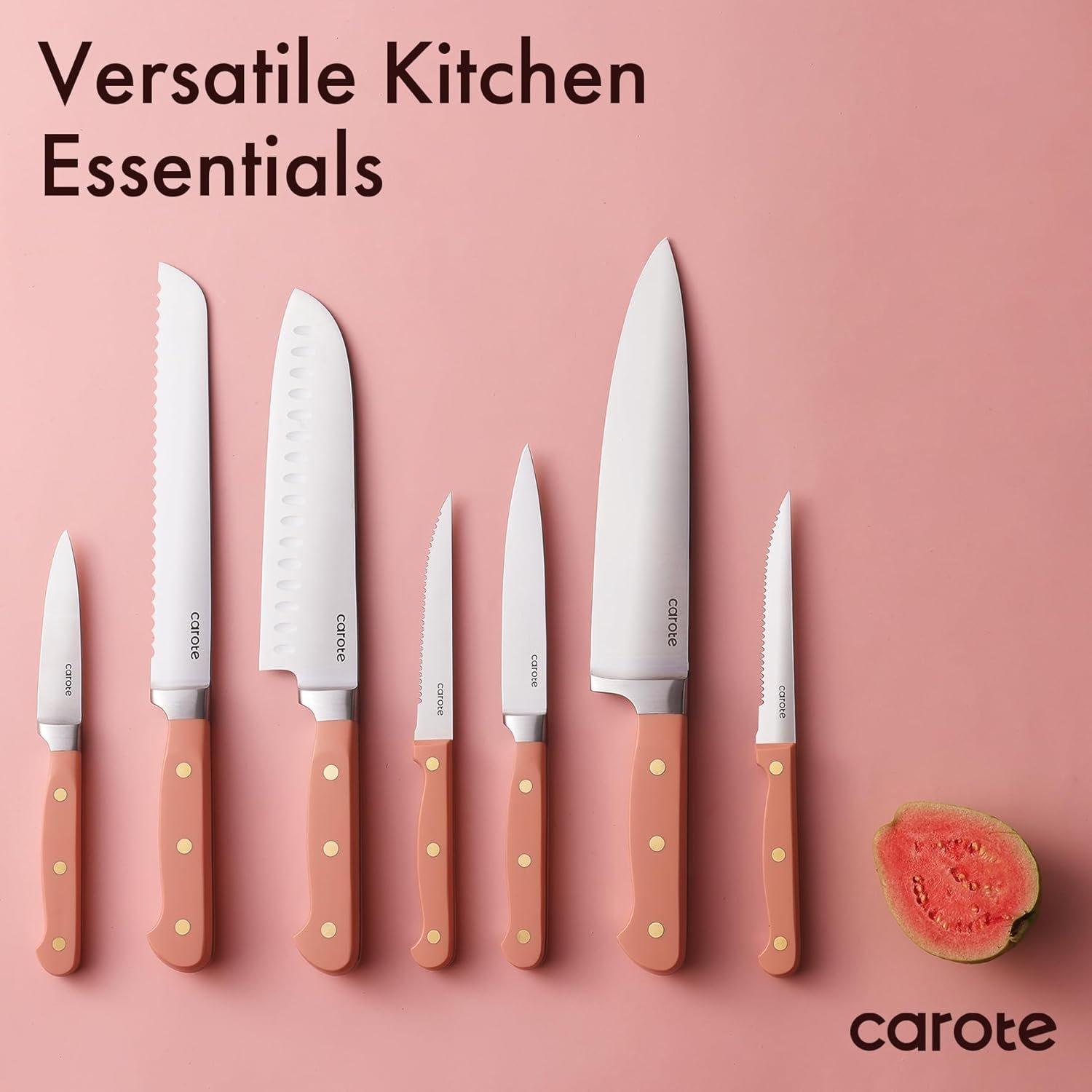CAROTE 11 Pieces Knife Set with Block for kitchen, Stainless Steel Razor-Sharp Blade, Triple Riveted Ergonomic Handle, Wooden Magnetic Block, Essential Knife Block Set, Pink