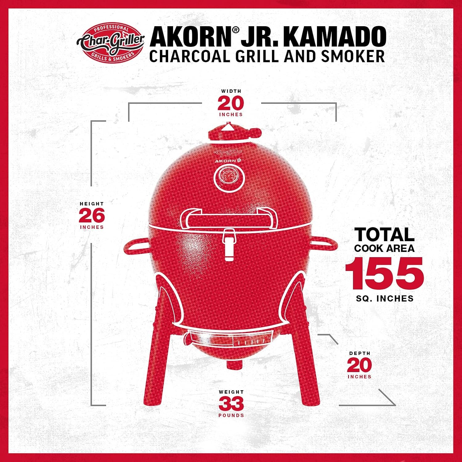 The Char-Griller Akorn Jr. Kamado portable Charcoal grill features dual dampers, heat Gauge, & Triple wall steel with insulation to deliver a superior grilling experience. The cast iron cooking grates keep flare-ups low & you can grill more with less charcoal. Our easy dump ash pan makes cleans up quick & easy, The hinged lid allows for easy access & keeps the lid in place while you cook. The AKORN Jr. Kamado offers easy mobility & portability with built in handles & a locking lid. Perfect for tailgating, camping, Park grilling or backyard barbecuing. Primary cooking area: 153 square inches.