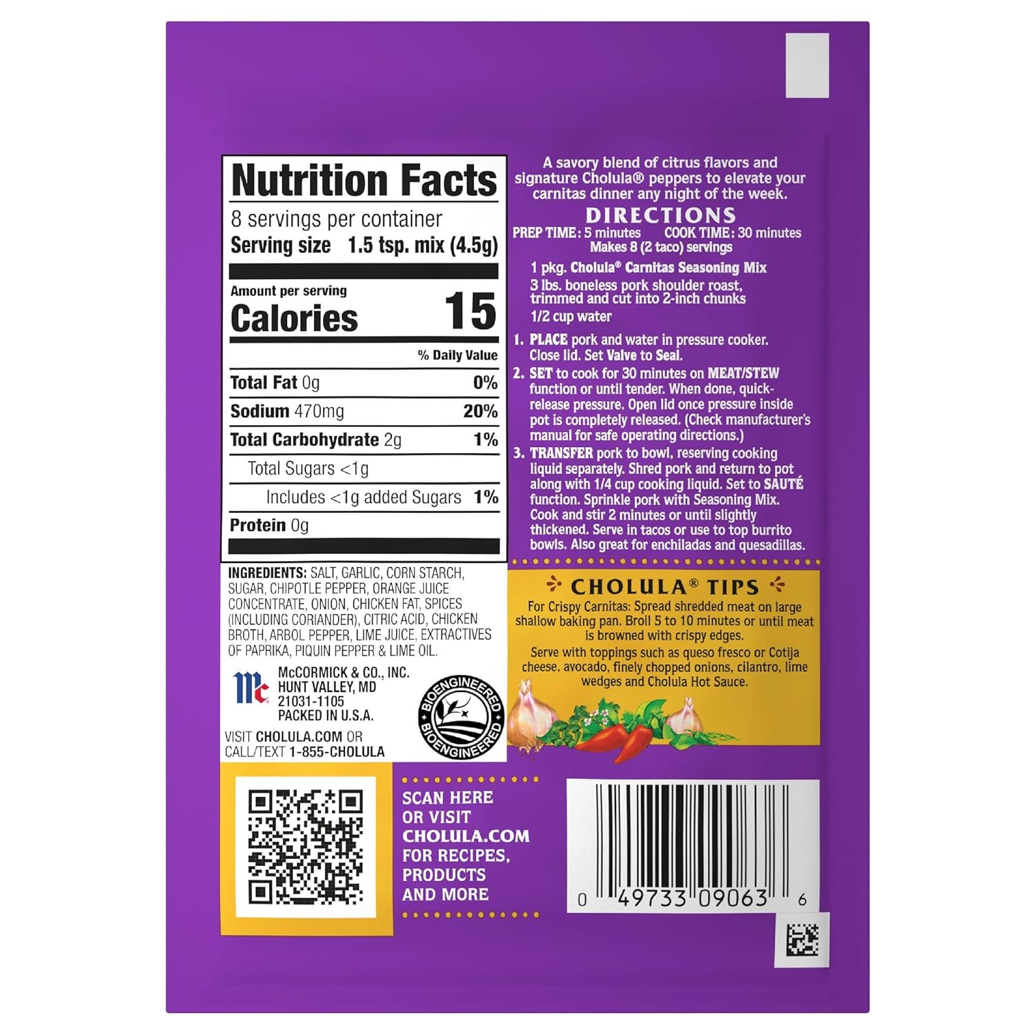 Invite flavor to your table with Cholula Pork Carnitas Mild Seasoning Mix. A savory blend of citrus flavors and signature Cholula peppers, seasoning mix makes it easy to serve up a delicious carnitas meal any day of the week. Carnitas, meaning “little meats,” is the Mexican version of pulled pork, infused with rich, Mexican-inspired flavors while slow cooking. You can recreate a similar taste and tenderness in your kitchen by preparing pork shoulder roast with Pork Carnitas Mild Seasoning Mix in a pressure cooker. The result is juicy, flavorful meat with that can be fork-shredded for tacos, burrito bowls, enchiladas and more. Garnish with toppings like avocado, a squeeze of fresh lime, and of course – a generous shake of Cholula Hot Sauce. Fall in love with Cholula from the very first bite. Whether you’re unscrewing the distinct wooden cap on our hot sauces, or cooking with our flavorful collection of salsas, seasoning mixes, cremosas, and more, a world of delicious possibilities is unlocked with the authentic Mexican flavor of Cholula.
