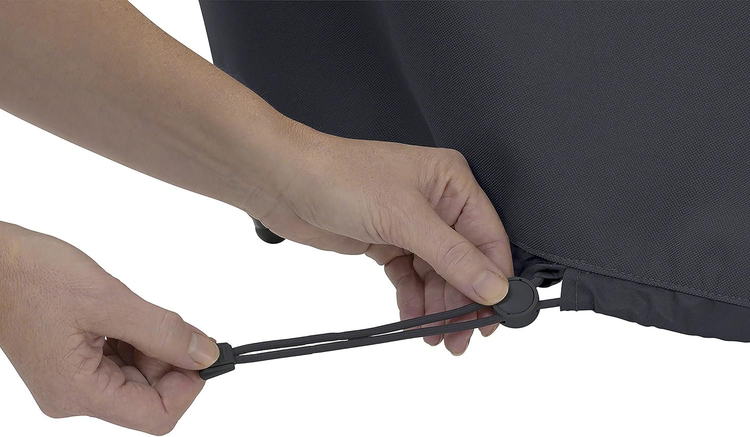 CUSTOM FIT OUTDOOR PATIO COVER: Water-resistant backing keeps your barbecue grill dry while elastic hem cords move easily through a special channel and custom-colored buckles attach for a snug fit
