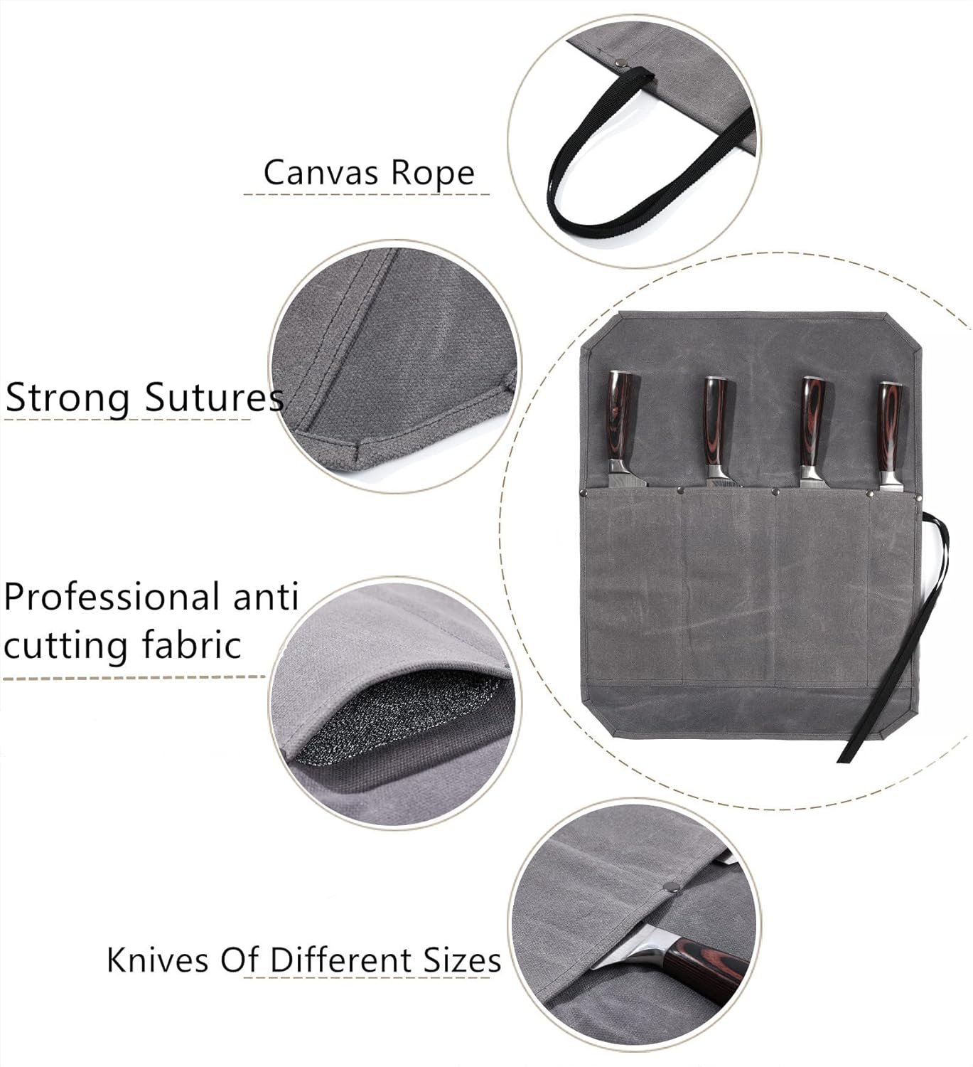 Denifiter Knife Roll, Professional Chef’s Knife Bag with Anti Cutting Fabric Inside & 4 Knife Slots Heavy Duty 20oz Waxed Canvas (Gray)
