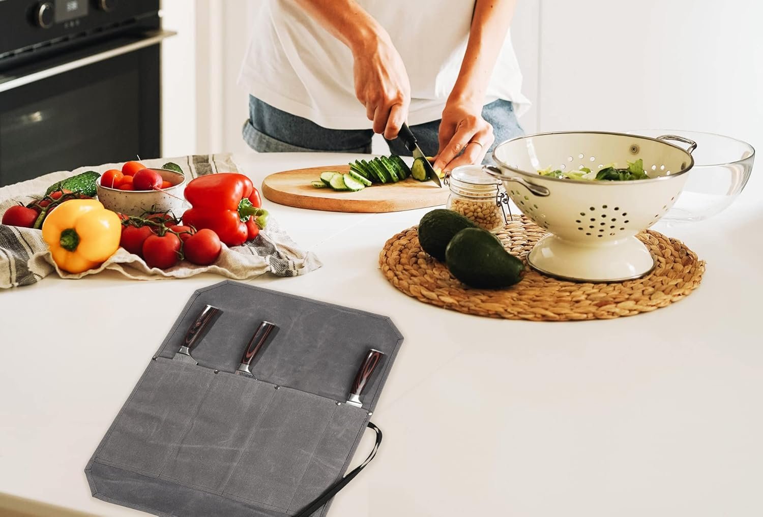 SIMPLE DESIGN: 4 slots, can store paring knife, sushi knife, scissors, meat cleaver. Soft and easy to roll up