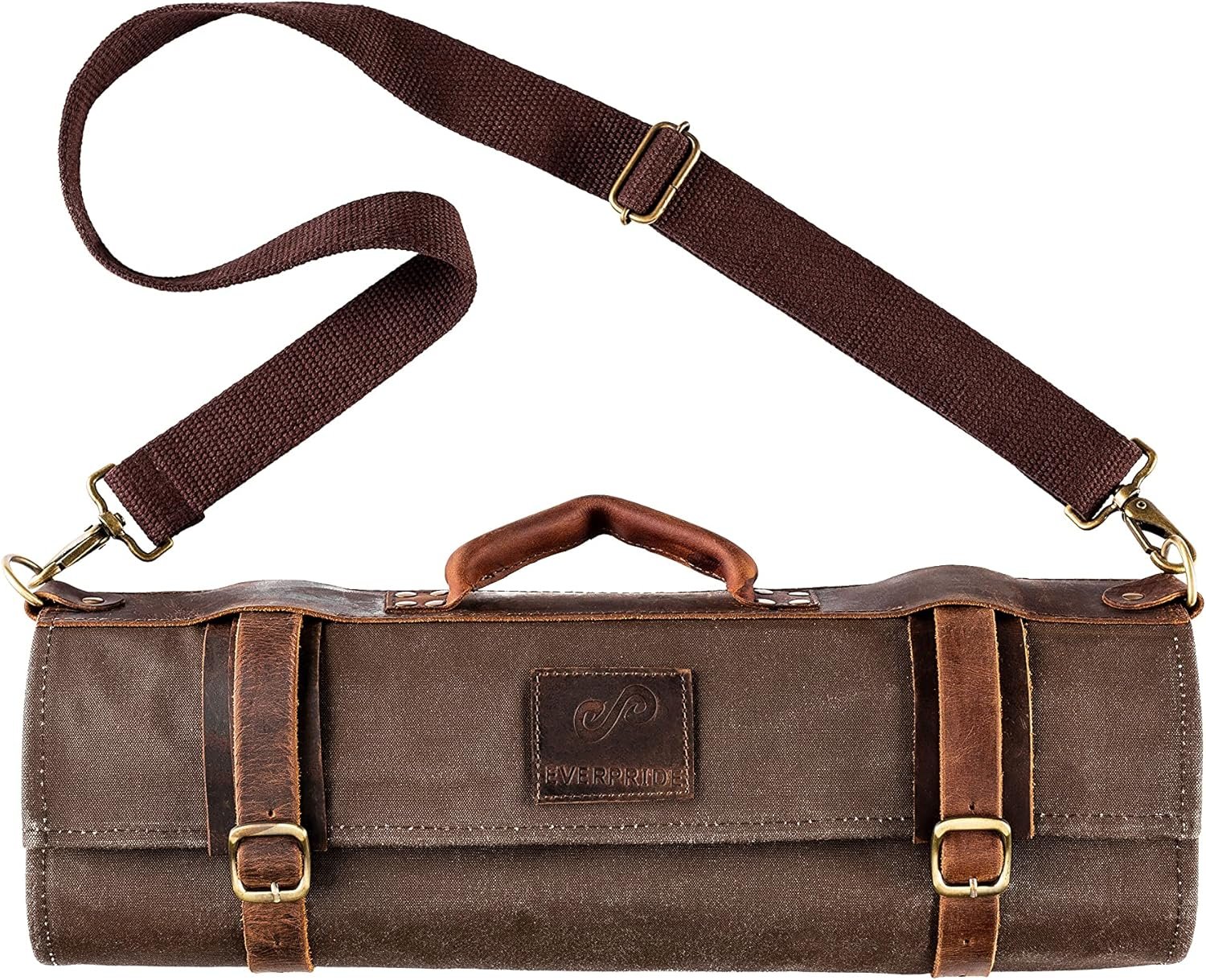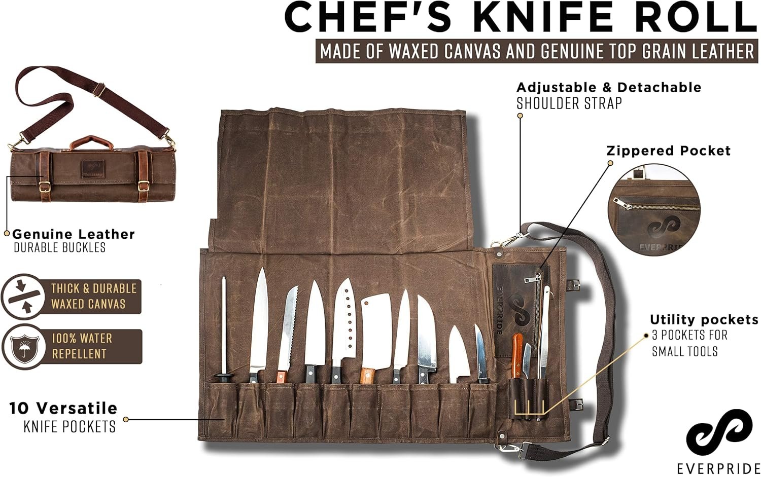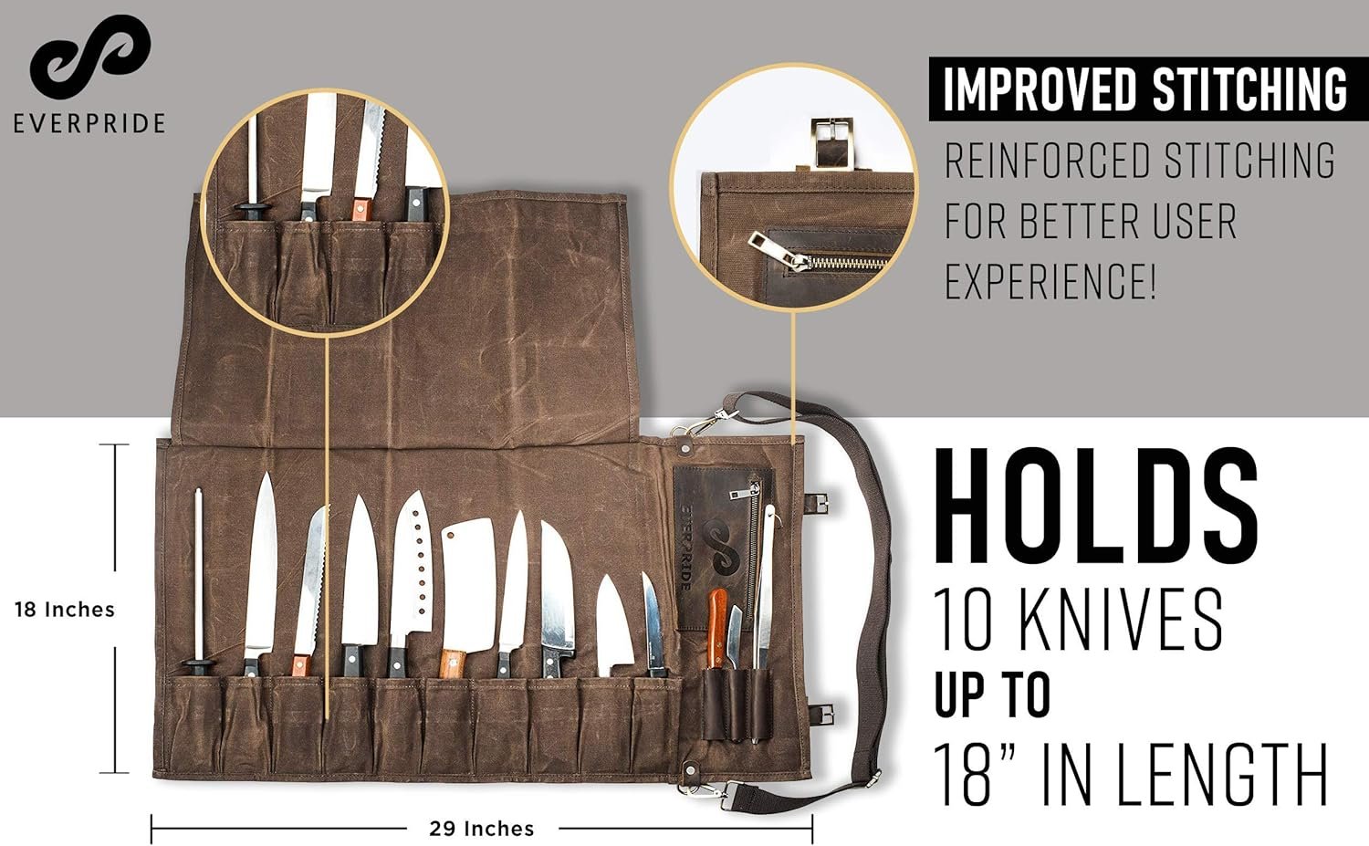 EVERPRIDE Waxed Canvas and Leather Chef Knife Roll Bag – Chef Bag Holds 10 Knives up to 15” PLUS Pocket for Cooking Accessories – Durable Knife Case for Professional Chefs – Knives Not Included