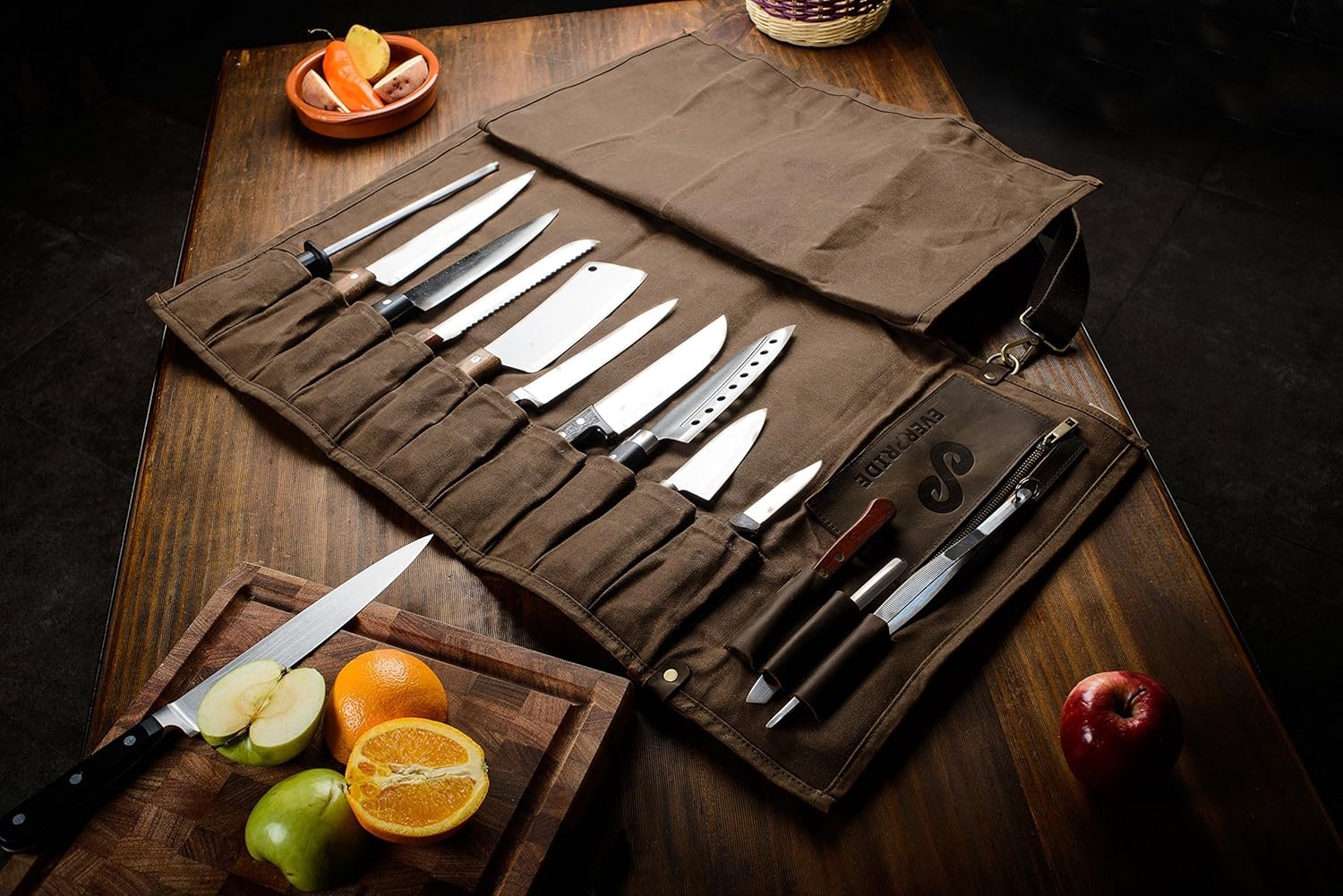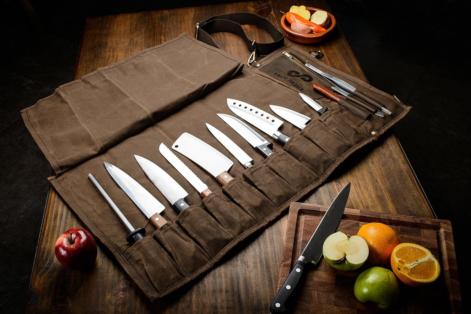 QUICK & EASY STORAGE – Our waxed canvas chef knife bag has an ergonomically compact design that holds knives up to 18.5” in length. It also stores kitchen utensils as well as culinary tools and form a tight roll when buckled.