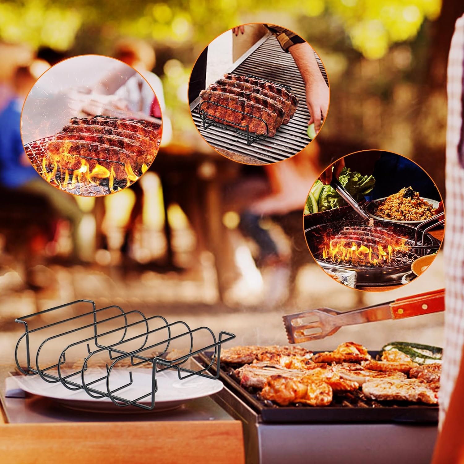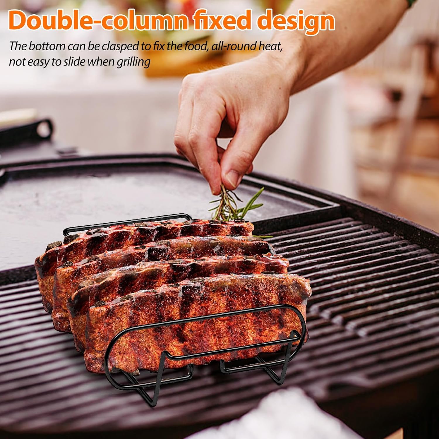 【𝗗𝗼𝘂𝗯𝗹𝗲-𝗰𝗼𝗹𝘂𝗺𝗻 𝗳𝗶𝘅𝗲𝗱 𝗱𝗲𝘀𝗶𝗴𝗻】Upright placement of ribs for easy grilling and cooking,The bottom can be clasped to fix the food, all-round heat, not easy to slide when grilling.
