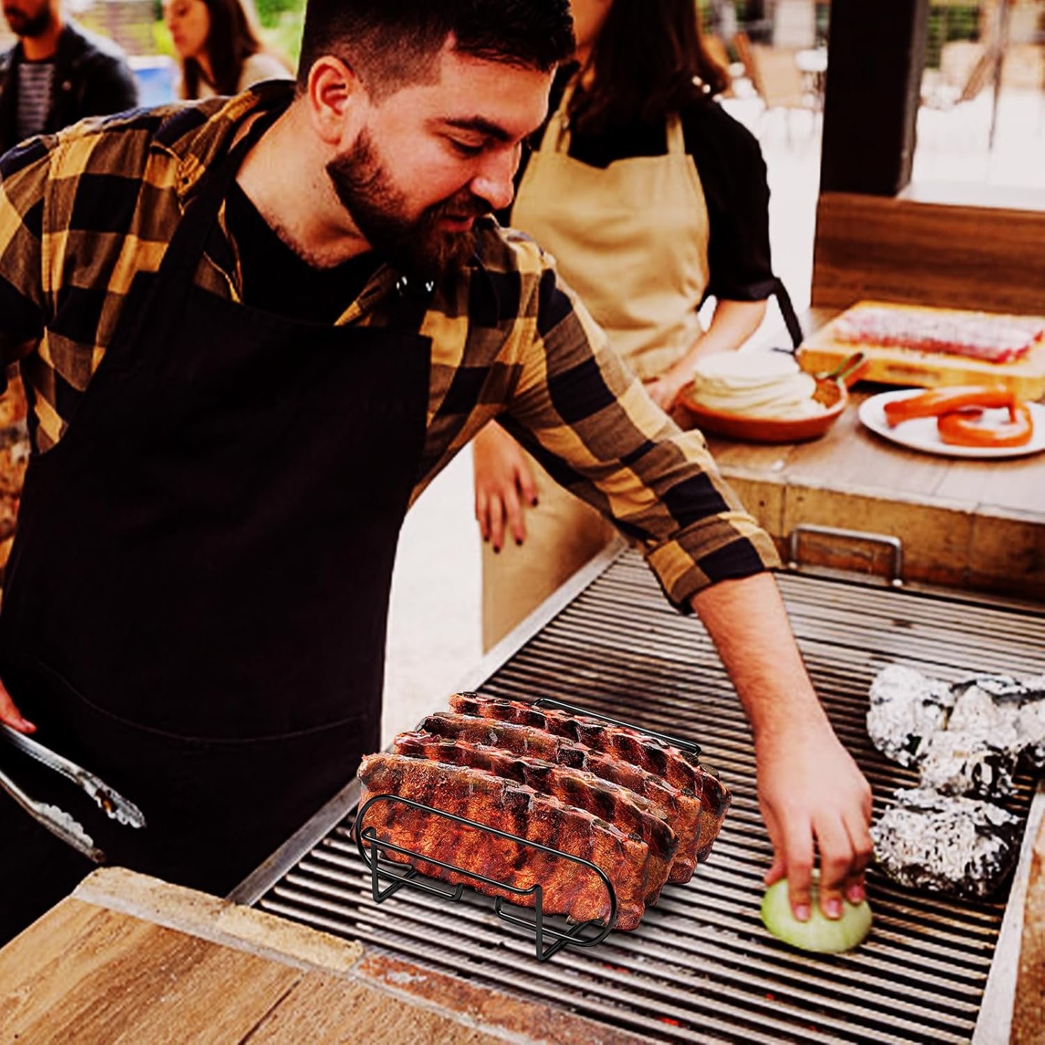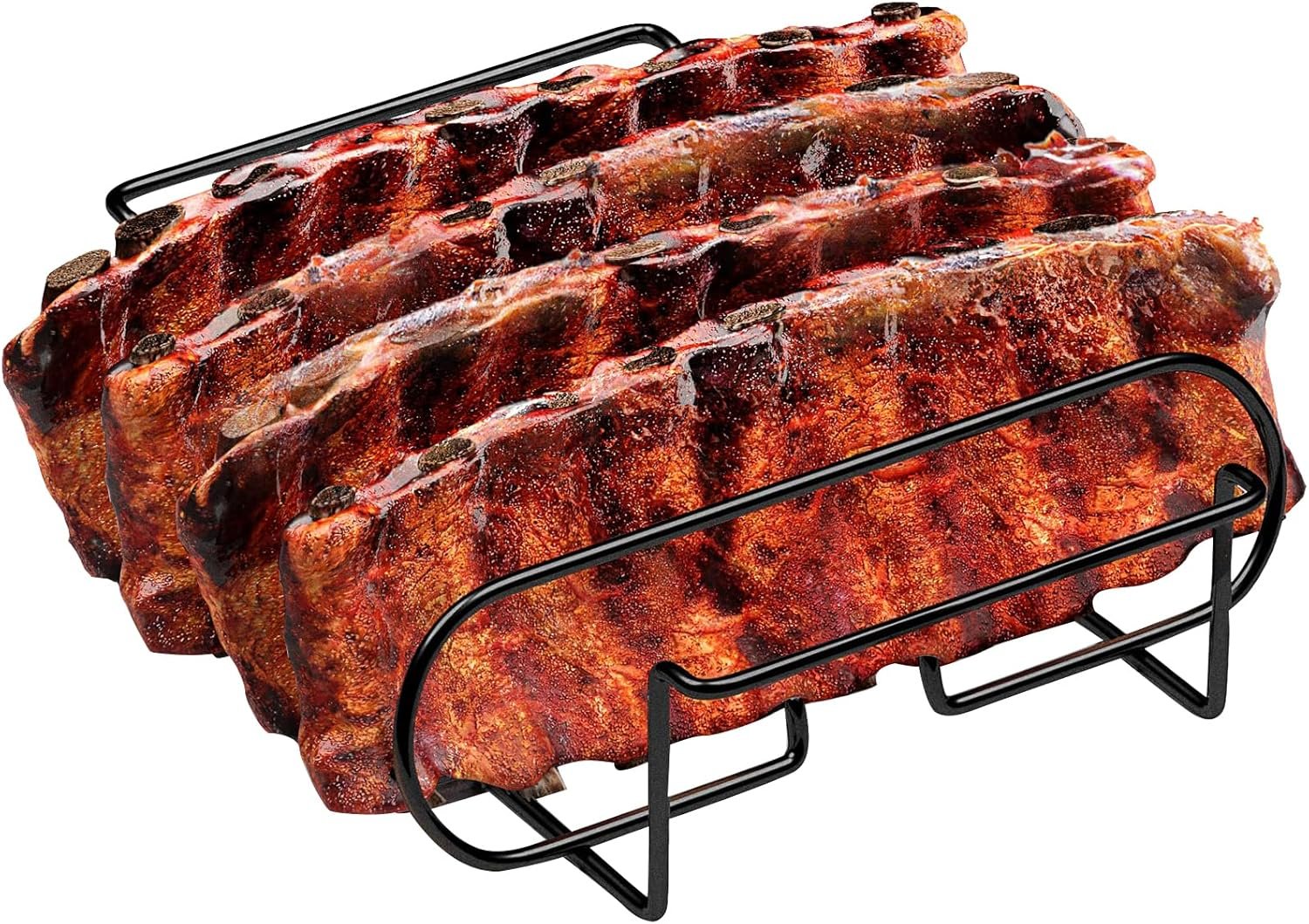 Extra Long Non-Stick Stainless Steel Rib Rack for Smoking and Grilling,Holds up to 4 Full Racks of Ribs, The perfect BBQ accessory for smoking and grilling,Black