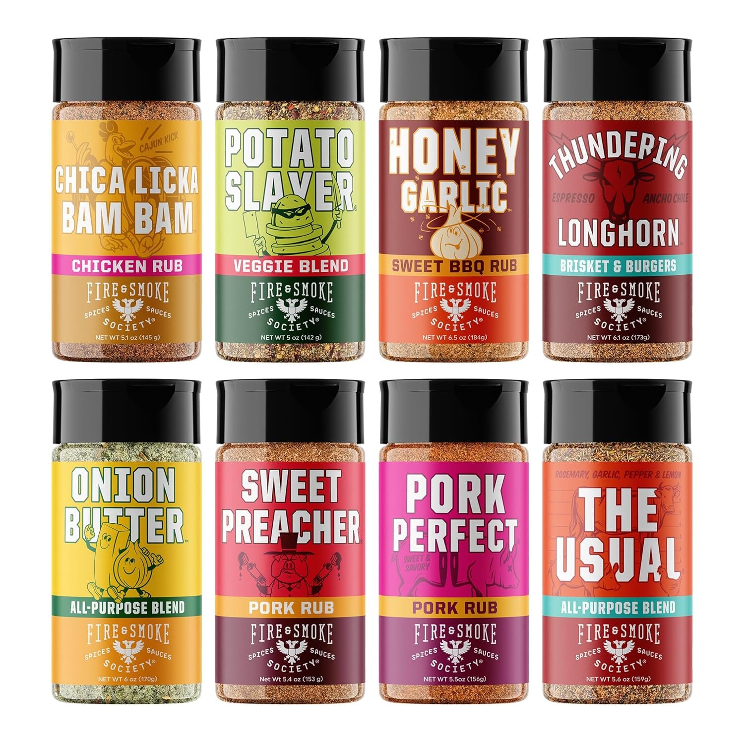 Fire & Smoke Society Essential Grill Variety Pack | BBQ Rubs and Seasonings, Grilling Gifts for Fathers Day, Mens Gifts | Steak Seasoning, Chicken, Burgers, Pulled Pork | Large Spices Set (8-Pack)