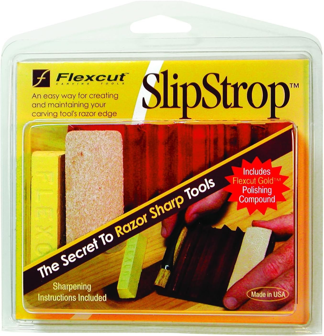 Includes 1 ounce bar of Flexcut Gold Polishing Compound. It has been specially formulated to apply to the strop like a crayon and quickly polish hardened steels.