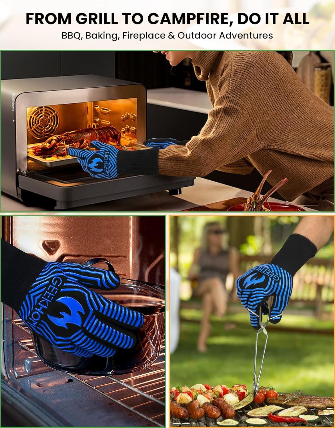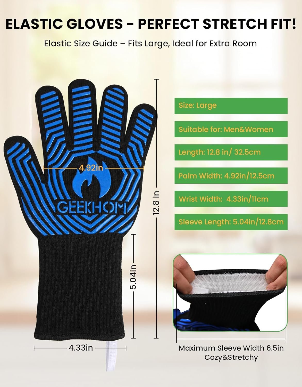 Extreme Heat Resistant BBQ Gloves: Crafted with advanced Aramid fiber, our GEEKHOM BBQ gloves offer extreme heat resistance up to 1472℉, safeguarding your hands during intense culinary adventures. Perfect for handling hot smoker grills and cast iron skillets with confidence.