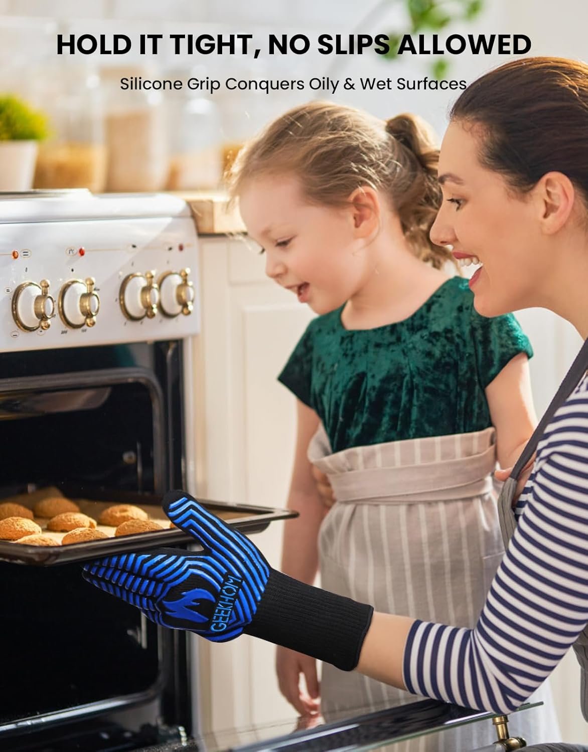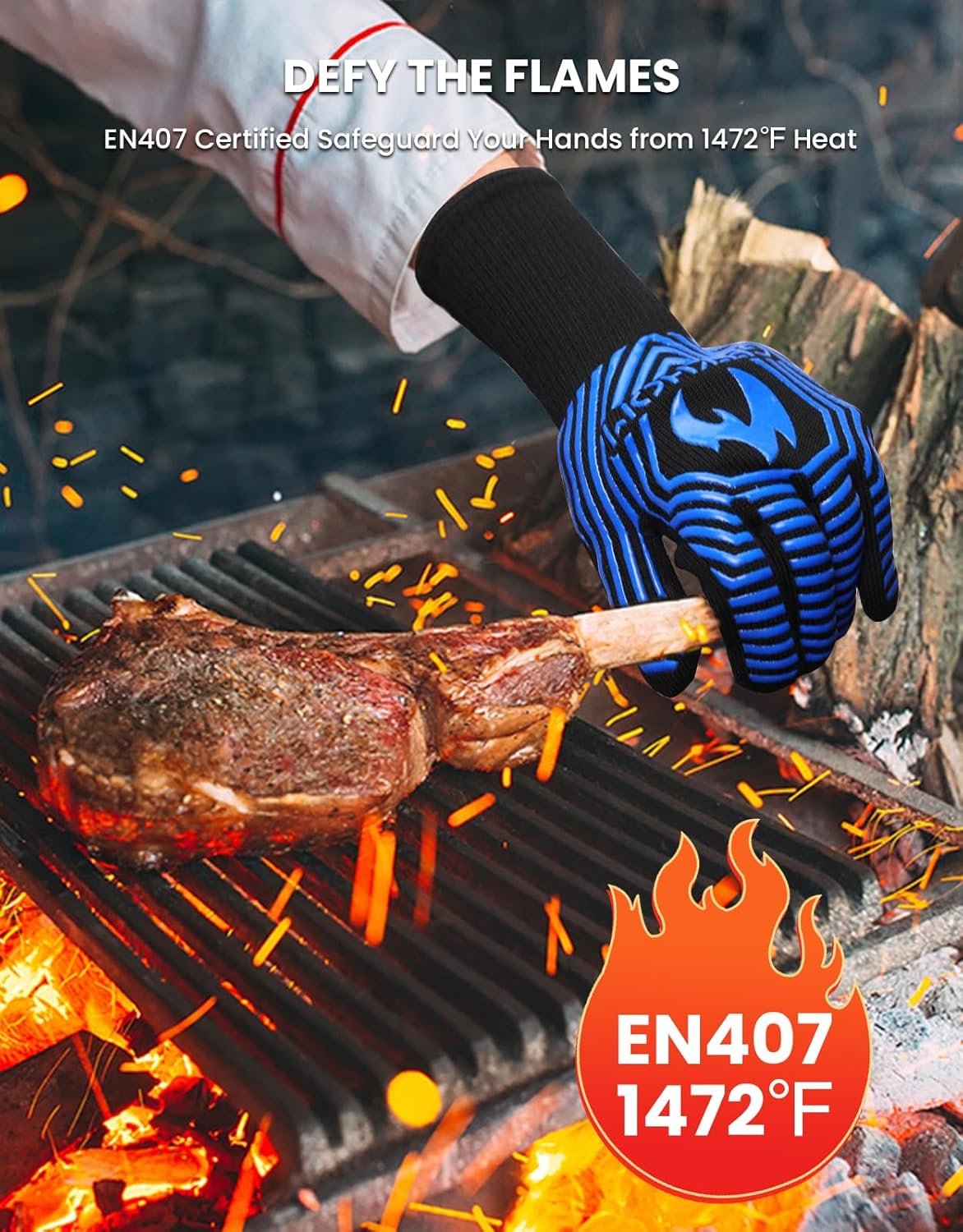 GEEKHOM BBQ Gloves, 1472 ℉ Heat Resistant Silicone Gloves EN407 Certified 13 Inch Non-Slip Kitchen Safe Gloves Professional Weber Fireplace Barbecue Accessories for Cooking Grilling, Baking