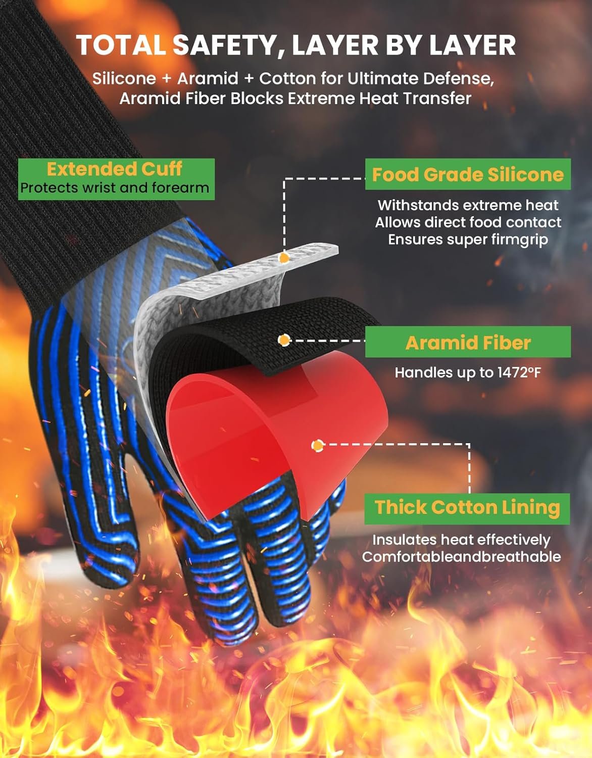 Triple-Layer Protection for Enhanced Safety: Featuring a silicone outer layer for non-slip grip, an Aramid fiber middle layer for superior heat resistance, and a cotton liner for ultimate comfort, these gloves provide comprehensive protection. Perfect for both professional chefs and home cooks seeking heat resistant gloves for their culinary endeavors.
