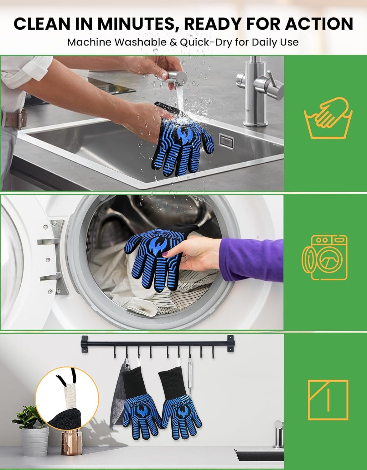 Machine Washable for Easy Care: Say goodbye to greasy, smelly gloves! Our GEEKHOM BBQ gloves are fully machine washable, making post-cooking cleanup a breeze. Simply throw them in the washing machine, then hang them up using the built-in loop for convenient storage. Warmly Note: Our gloves fit loosely for comfort; check the size guide. Packaging may show other products, but details apply to 1472℉ gloves only.
