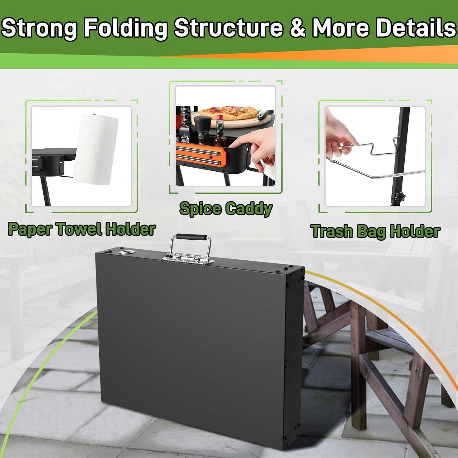 Multifunctional Set of Grill Table: You can arrange as many seasonings as you like in the grill caddy, that will make the meat more delicious! The paper towel holder makes the paper towel within reach. The new magnetic suction sector gives your spatula a home. Four hooks can be placed at will towels, and barbecue utensils, within reach, so that you can release your hands. Attentive to the beer opener, to open the grill’s tasty!