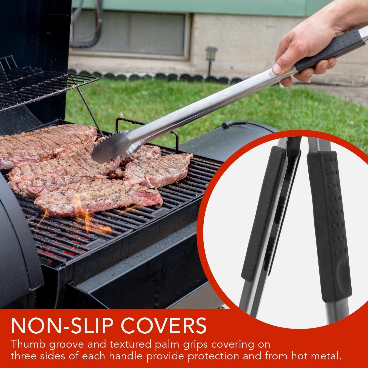 Three Sided Non-slip Textured Handle Covers: The three sided silicone handle covers measure 1/8 inch thick and 5 inches long with a textured non-slip surface, protecting your hands and from being burned by the metal grill tongs. Our barbecue tongs also feature a thumb groove for added gripping pressure, perfect for cooking heavy meats like steaks.